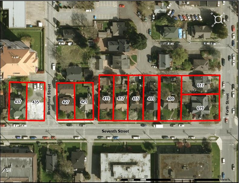 11 property land assembly in Uptown New Westminster on Seventh Street and Fourth Ave. It is a very central location, in close walking distance to the Royal City Centre, Save-On Foods, London Drugs and many cafes, banks and restaurants. The city has recently released its new OCP. They refer to this area as the Bent Court Study area. They wish to preserve some of the houses that have heritage value while recognizing existing entitlements (up to max 5.2 FSR under existing C-3 zoning). In this assembly, there are extra lots that can be used to relocate heritage houses. City will consider relaxing parking and commercial requirements and density transfers through heritage revitalization agreement. Pricing is $105 per buildable sq ft.