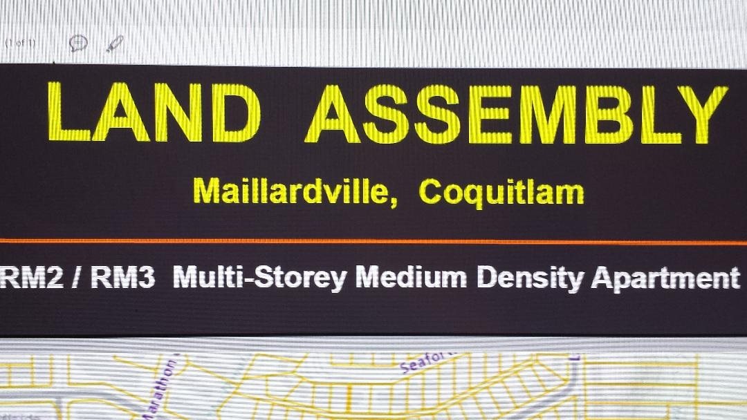 LAND ASSEMBLY INVESTMENT opportunity for BIG development SITE flat Location . DEVELOPERS INVESTORS. ALERT Possible for HIGH RISE Rezoning The site is designated for medium density - RM 2 and RM 3, permitting construction of multi-storey residential apartment buildings up to 8 levels NOW Gross floor area of 1.85 (buyer to verify). It is in the prime location of Maillardville, Coquitlam, just minutes away from Highway #1, Lougheed Highway, transit, supermarkets, shopping, and recreation.
