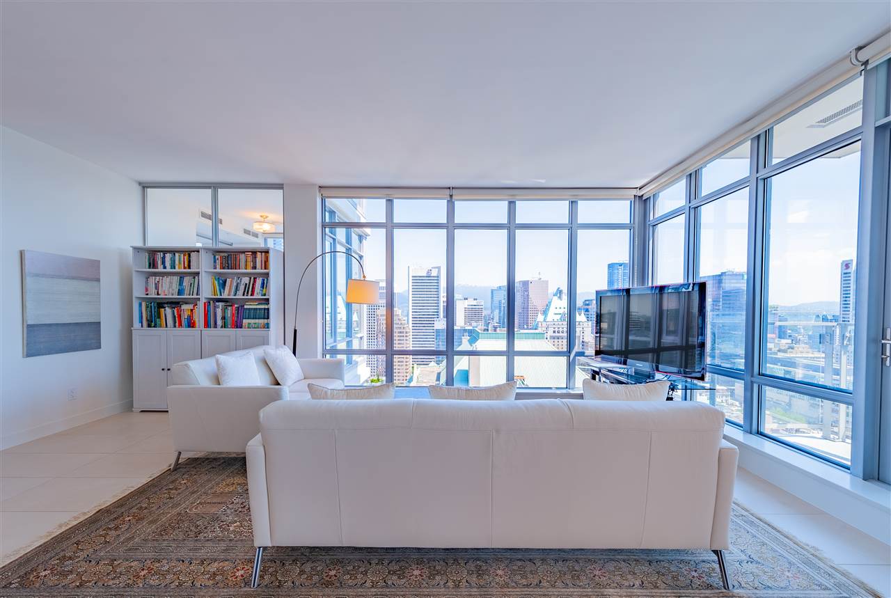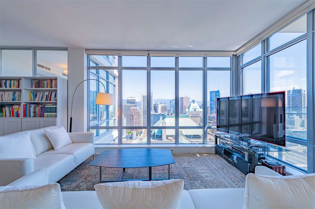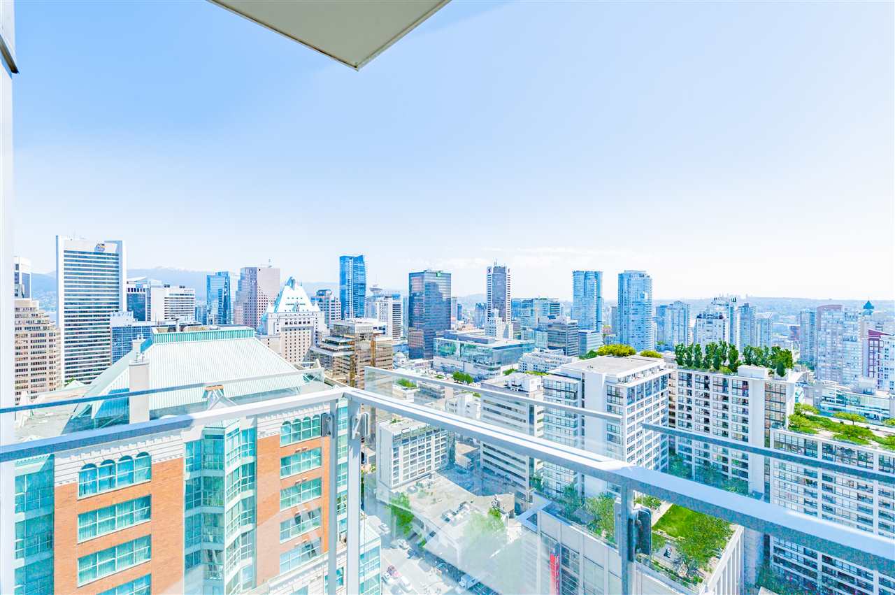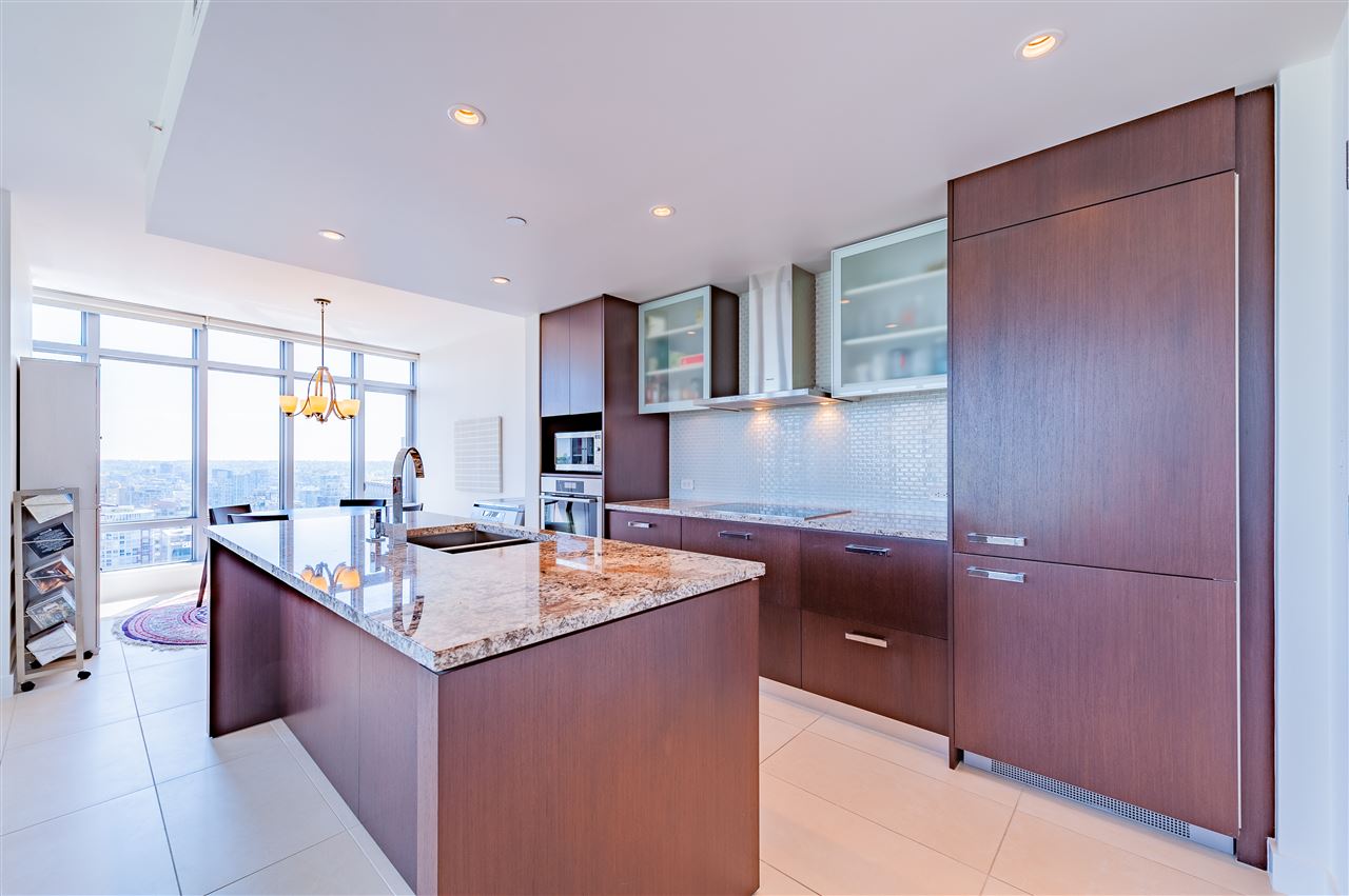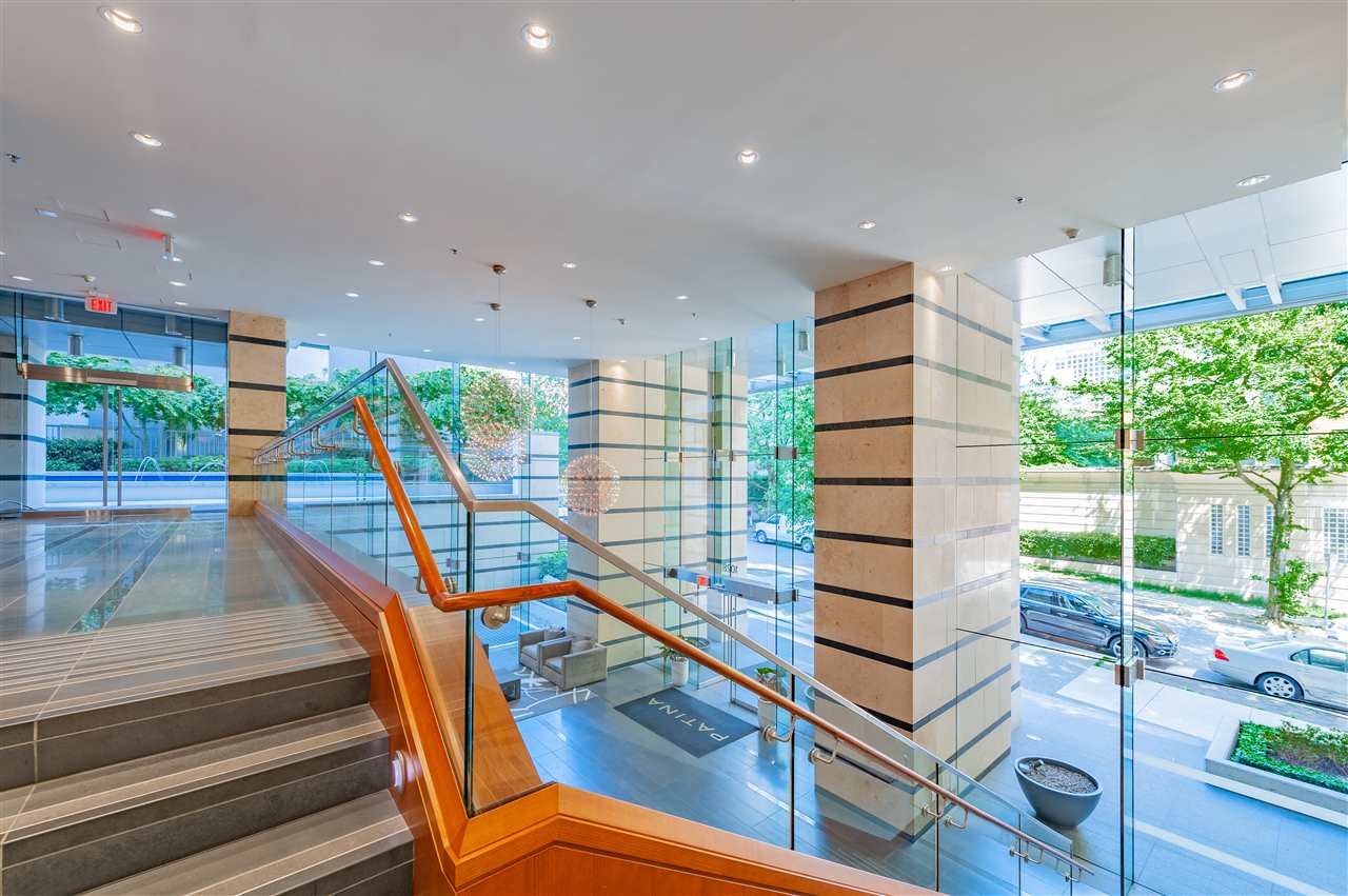 Luxury living in on the 30th floor. Patina built by Concert Properties offers the finest materials & finishes with geothermal heating/cooling(Air-Conditioning). This 1,322 sq. ft. northeast facing corner suite has an open floor plan with 2 beds/2 baths, separate den, storage room, Italian porcelain tile floors, over height smooth ceilings, heated floors, spa-like baths, glass/tiled walk-in-showers, soaker tub and a gourmet kitchen w/ Miele, Maytag, Liebherr Appliances & granite countertops. Expansive views from West Vancouver to Mount Baker and stunning night views. 24-hour concierge, fully equipped fitness center, rooftop garden and social lounge. Located in the heart of downtown Vancouver and steps to YMCA, movie theater, & restaurants.