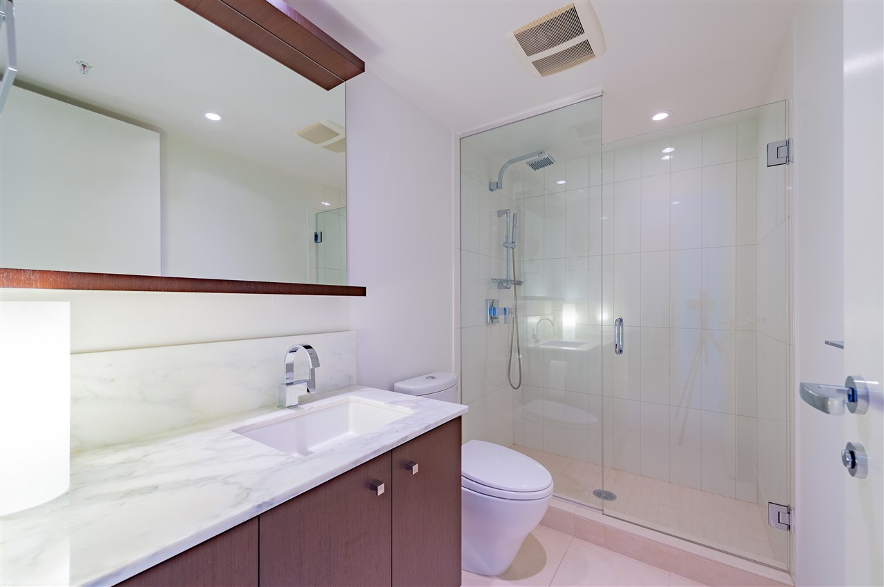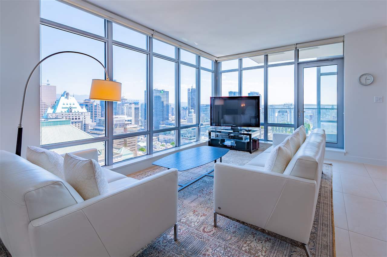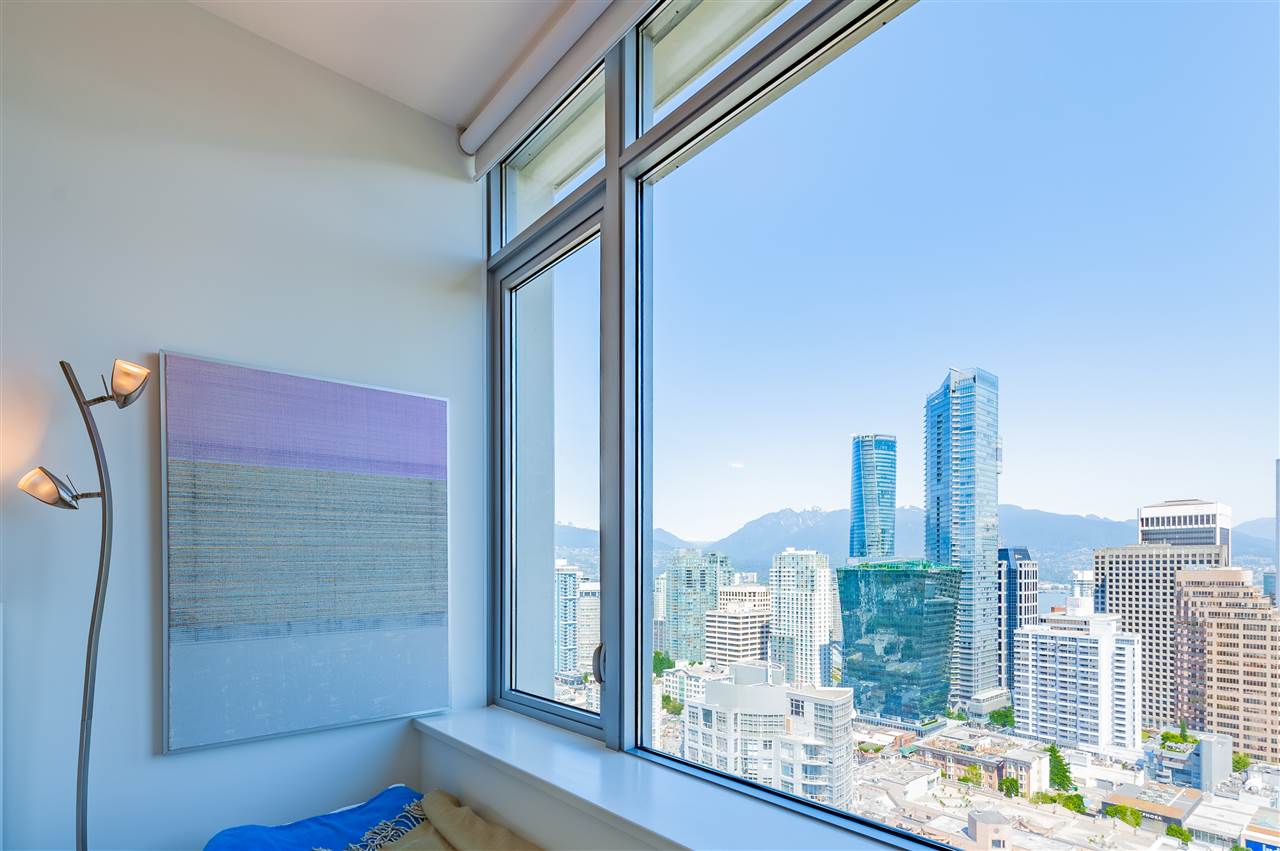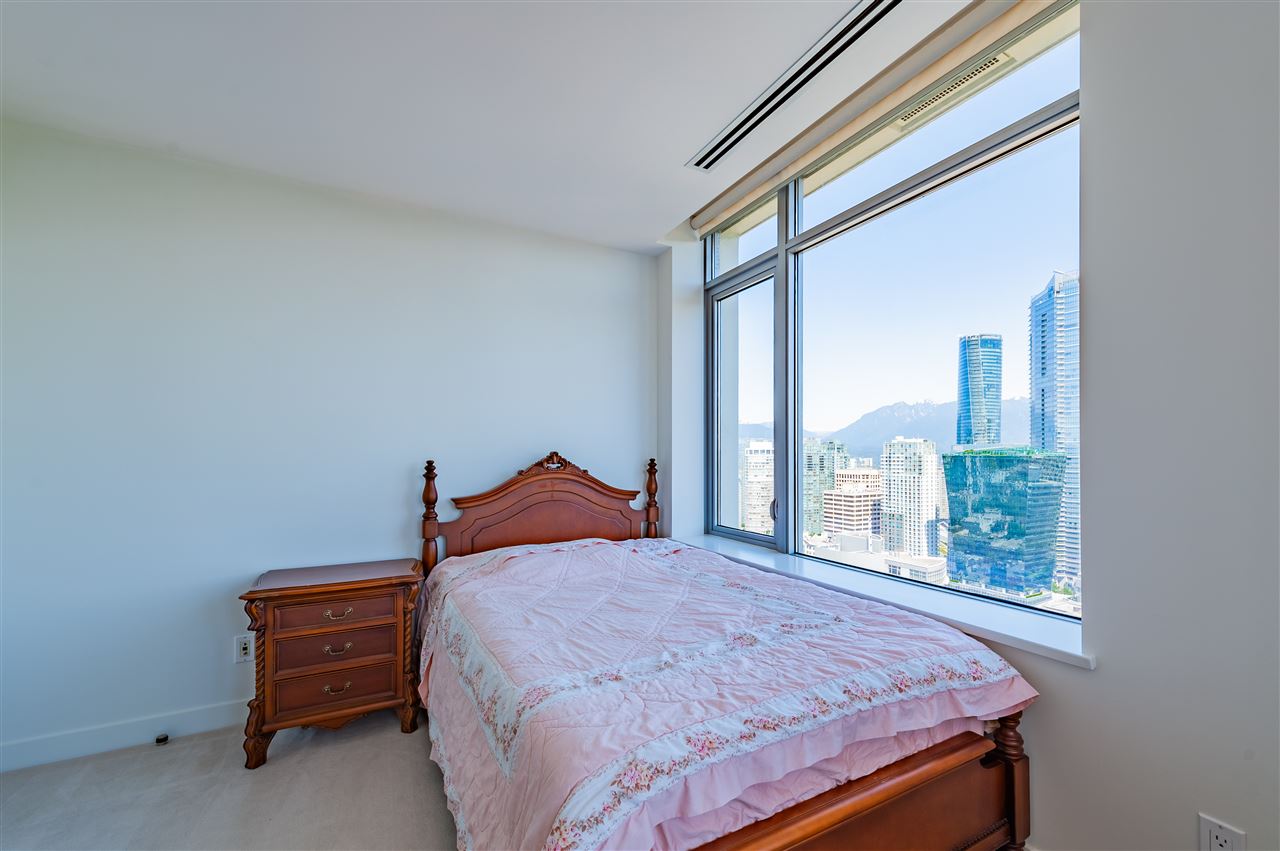 Luxury living in on the 30th floor. Patina built by Concert Properties offers the finest materials & finishes with geothermal heating/cooling(Air-Conditioning). This 1,322 sq. ft. northeast facing corner suite has an open floor plan with 2 beds/2 baths, separate den, storage room, Italian porcelain tile floors, over height smooth ceilings, heated floors, spa-like baths, glass/tiled walk-in-showers, soaker tub and a gourmet kitchen w/ Miele, Maytag, Liebherr Appliances & granite countertops. Expansive views from West Vancouver to Mount Baker and stunning night views. 24-hour concierge, fully equipped fitness center, rooftop garden and social lounge. Located in the heart of downtown Vancouver and steps to YMCA, movie theater, & restaurants.