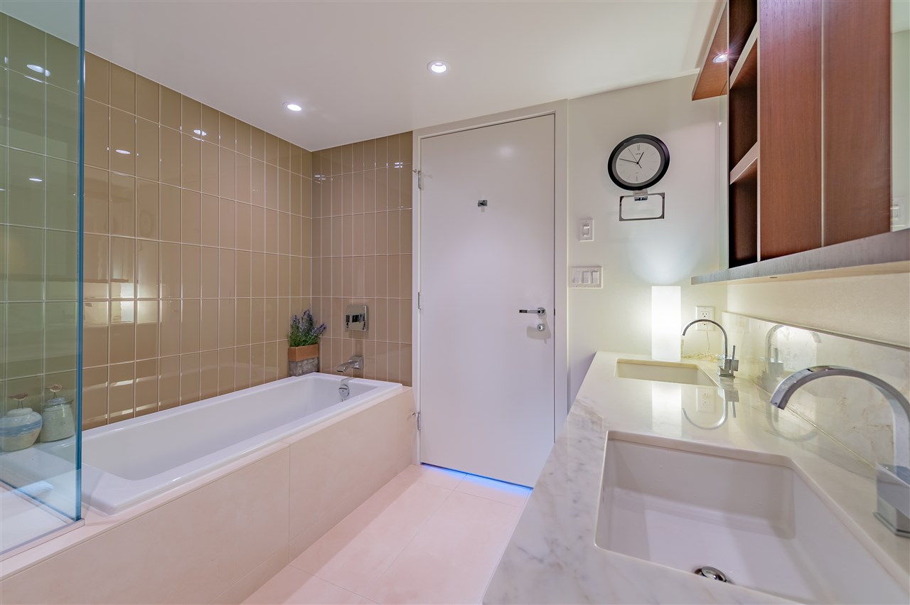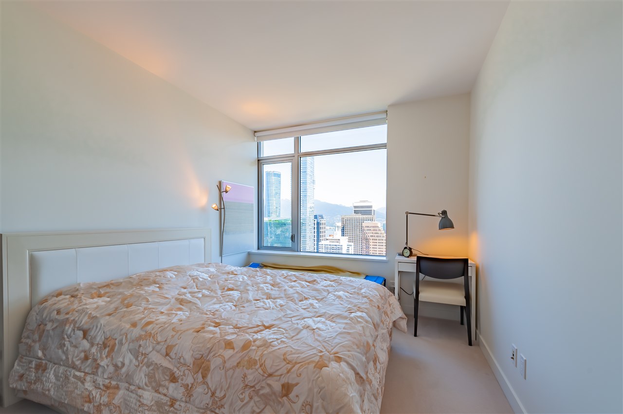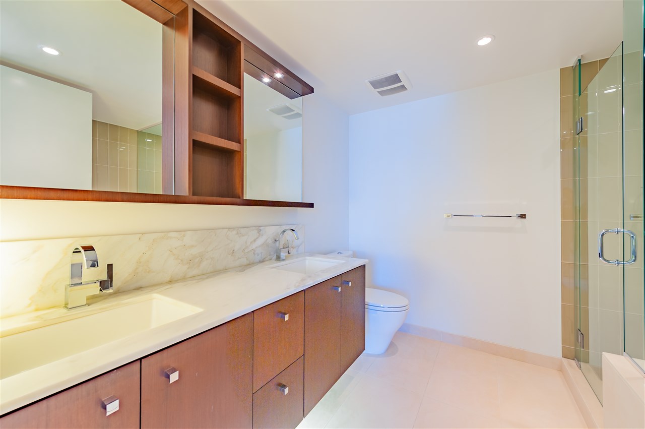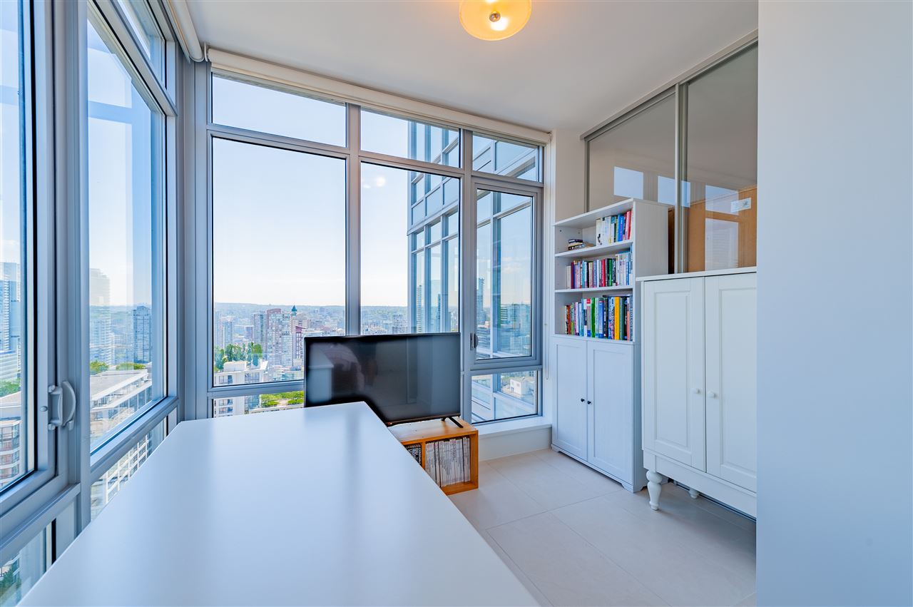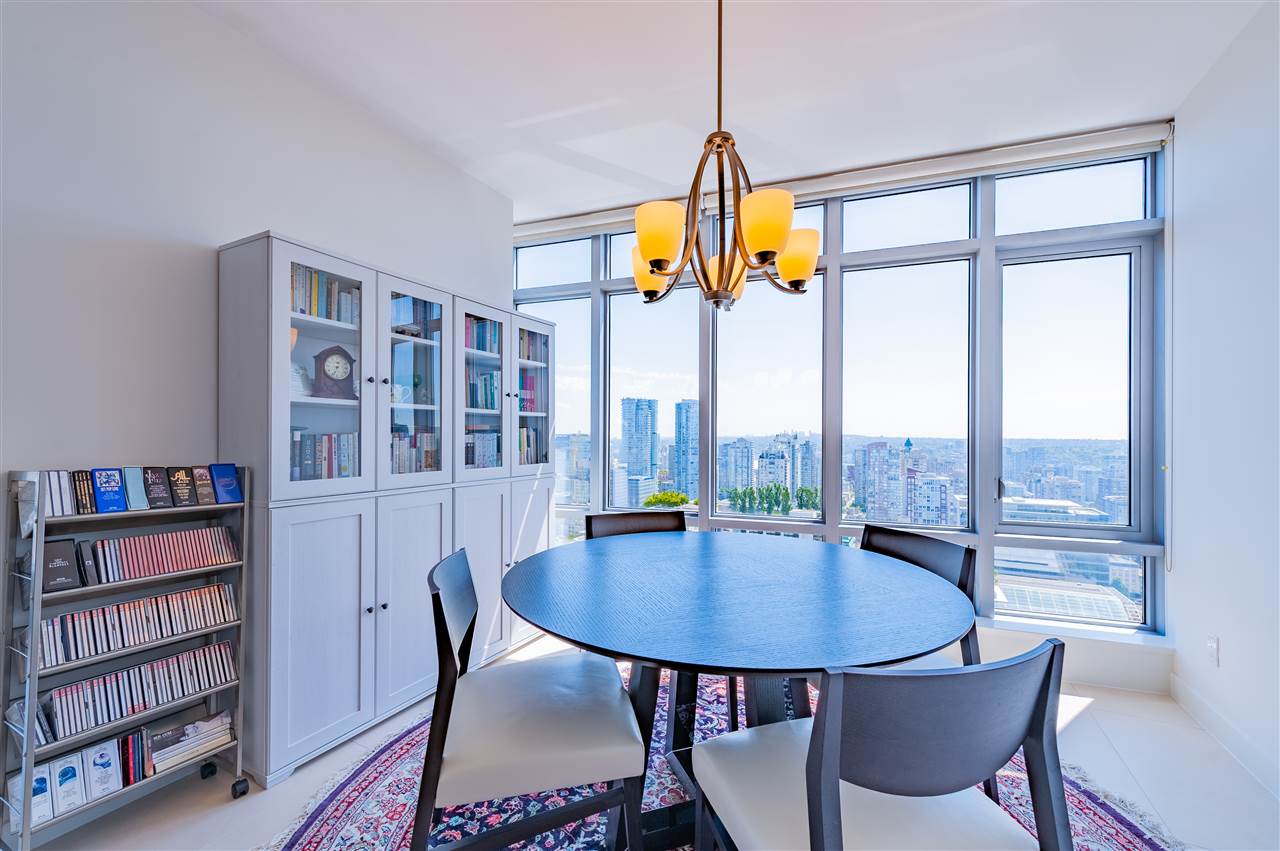 Luxury living in on the 30th floor. Patina built by Concert Properties offers the finest materials & finishes with geothermal heating/cooling(Air-Conditioning). This 1,322 sq. ft. northeast facing corner suite has an open floor plan with 2 beds/2 baths, separate den, storage room, Italian porcelain tile floors, over height smooth ceilings, heated floors, spa-like baths, glass/tiled walk-in-showers, soaker tub and a gourmet kitchen w/ Miele, Maytag, Liebherr Appliances & granite countertops. Expansive views from West Vancouver to Mount Baker and stunning night views. 24-hour concierge, fully equipped fitness center, rooftop garden and social lounge. Located in the heart of downtown Vancouver and steps to YMCA, movie theater, & restaurants.