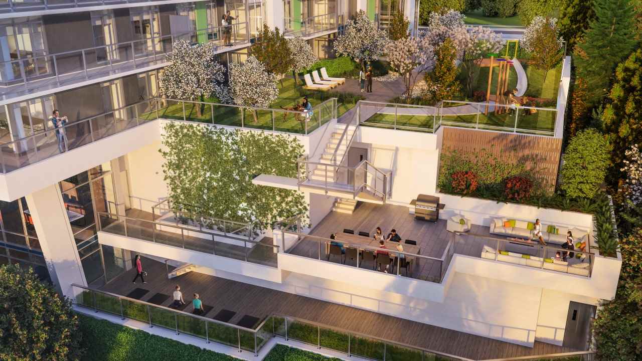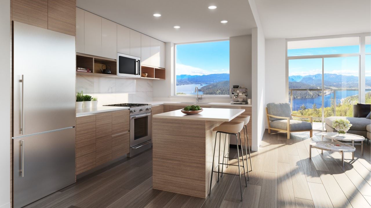 Terraces at the Peak ascends 13 storeys into the sky at SFU University on Burnaby Mountain, the highest point in Metrotown Vancouver. The tall, concrete boutique structure with 117 homes is uniquely stepped in form & captures the West Coast's most coveted views. Witness the sun rise over Howe Sound & set upon Burrard Inlet & gaze at the towering North Shore mountains - all whilst enjoying a quiet moment on the spacious 1320 SF walkout terrace. This bright, open floor plan has 9' & 10' ceilings, elegant wide plank laminate flooring throughout the living areas & plush carpeting in the two bedrooms. This unit comes with upgraded stainless steel appliances, two parking spaces, a storage locker & a bike locker. Don't miss out!