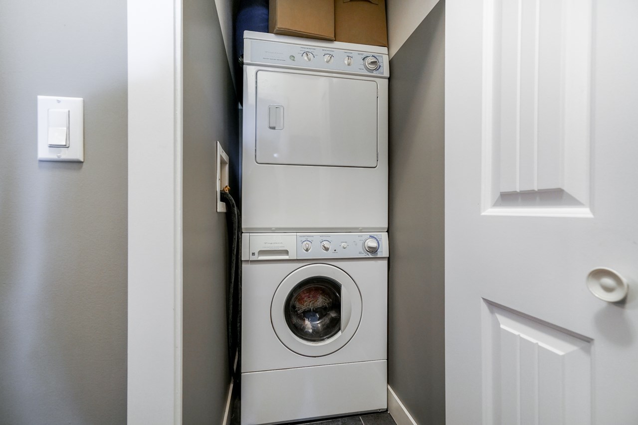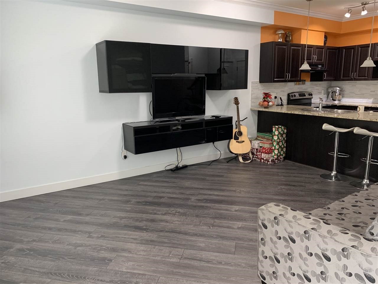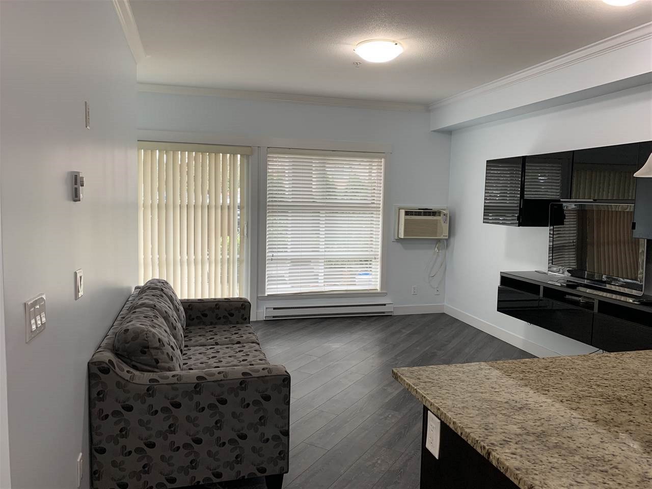 The best in convenience and location. This 1 bed, 1 bath condo offers a large 20 by 25, partially covered patio space. Enter from the hall or from the patio entrance. The unit has nice high ceilings, dark kitchen cabinets with brand new doors, and new tiles and laminate. Space is not an issue with this floor plan which offers a double closet in the bedroom, in suite laundry, bike storage, and storage locker. Top that off with new paint through out & NEW vanity, air conditioning, and an update bathroom featuring a brand new jetted bathtub. The complex has a great exercise centre and other amenities for residents. All this in a location that is central to everything, shopping, doctors, restaurants.