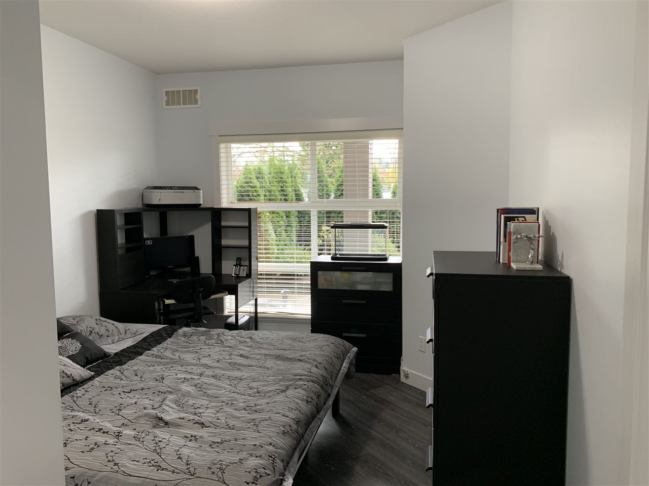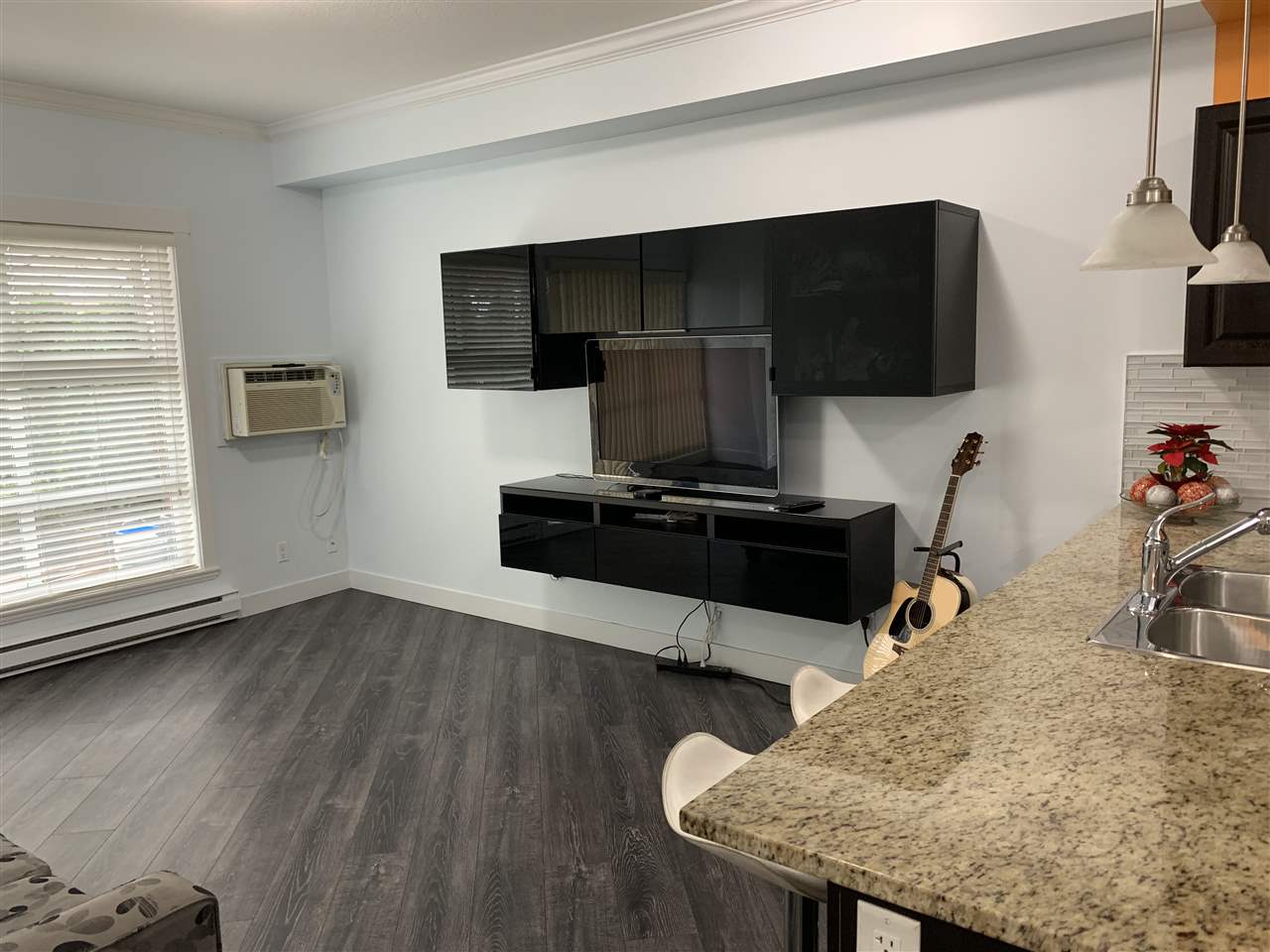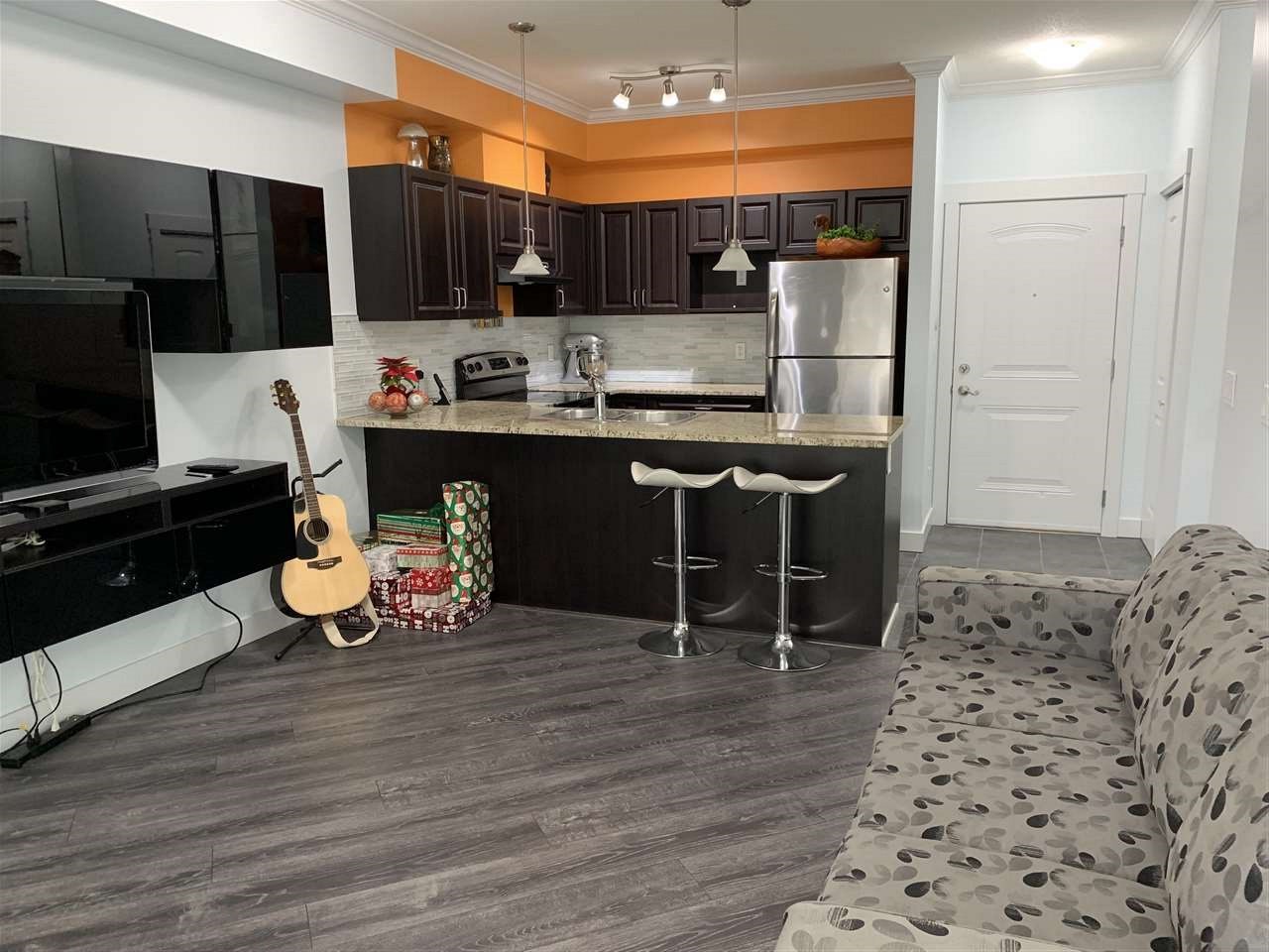 The best in convenience and location. This 1 bed, 1 bath condo offers a large 20 by 25, partially covered patio space. Enter from the hall or from the patio entrance. The unit has nice high ceilings, dark kitchen cabinets with brand new doors, and new tiles and laminate. Space is not an issue with this floor plan which offers a double closet in the bedroom, in suite laundry, bike storage, and storage locker. Top that off with new paint through out & NEW vanity, air conditioning, and an update bathroom featuring a brand new jetted bathtub. The complex has a great exercise centre and other amenities for residents. All this in a location that is central to everything, shopping, doctors, restaurants.
