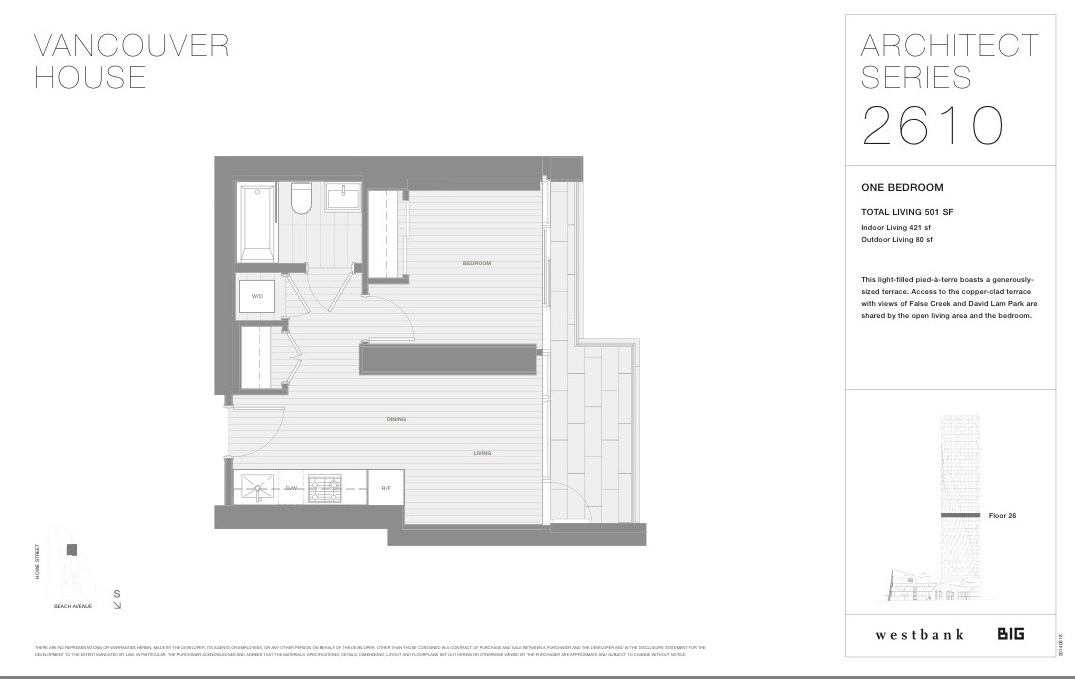 MOTIVATED SELLER A rare opportunity to own a Vancouver House 1 bdrm + 1 bath suite with amazing city views. Designed by BJARKE INGELS Group and built by Westbank. This beautiful home on the 26th floor has 421 sqft of indoor living space and 80 sqft, for a total of 501 sqft.