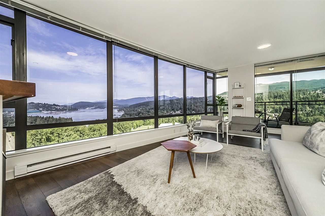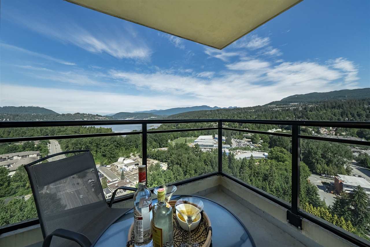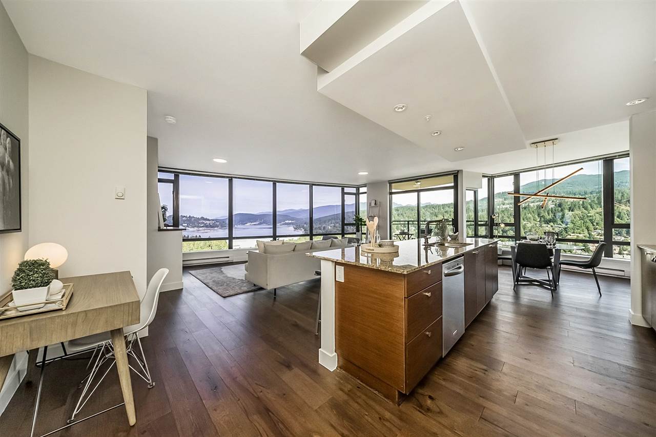 RARE OPPORTUNITY TO PURCHASE THIS SUB-PENTHOUSE w/ an unbelievable unobstructed 270 degree view of the Inlet & mountains; arguably the Best Views in Suterbrook Village. Open concept layout with wall-to-wall windows. Features brand new engineered hardwood & baseboards, freshly painted with new LED light fixtures, big covered deck off living area; dream kitchen w/ granite coutertops, new backsplash, & S/S appliances. First-class amenities including a full gym, pool, hot tub, sauna, steam room, squash court, theatre room, pool table, outdoor terrace and more. Great location! Steps to skytrain, market, shops, cafes & restaurants; minutes from Coquitlam Centre, Lougheed Mall, Rocky Point Park/Marina/Trails, Rec Centre/Library and more. 2 parking/1 locker.