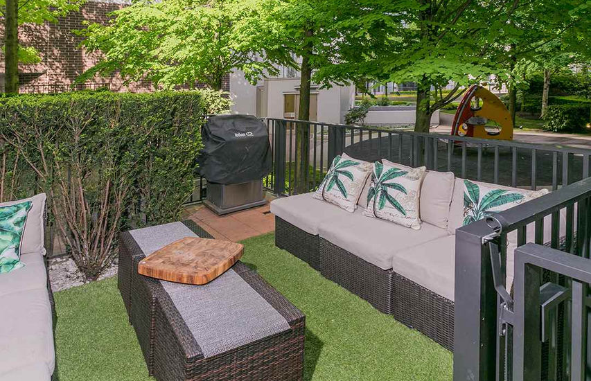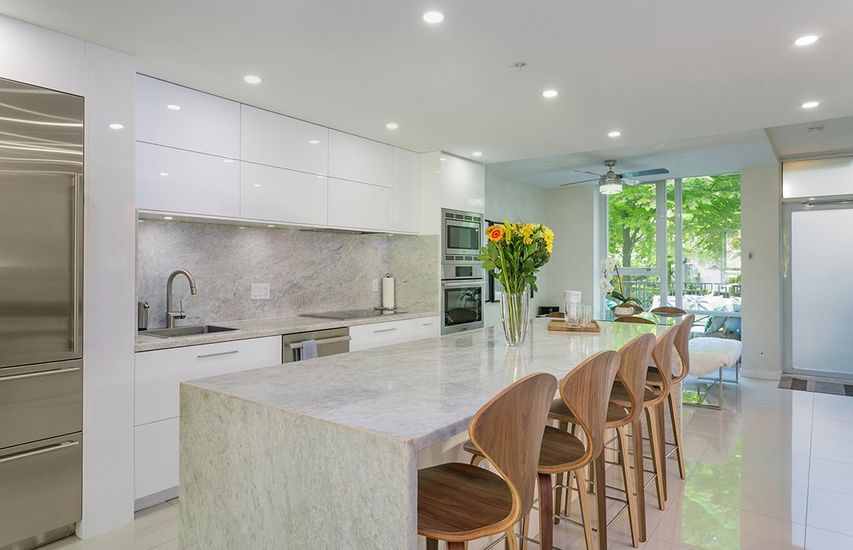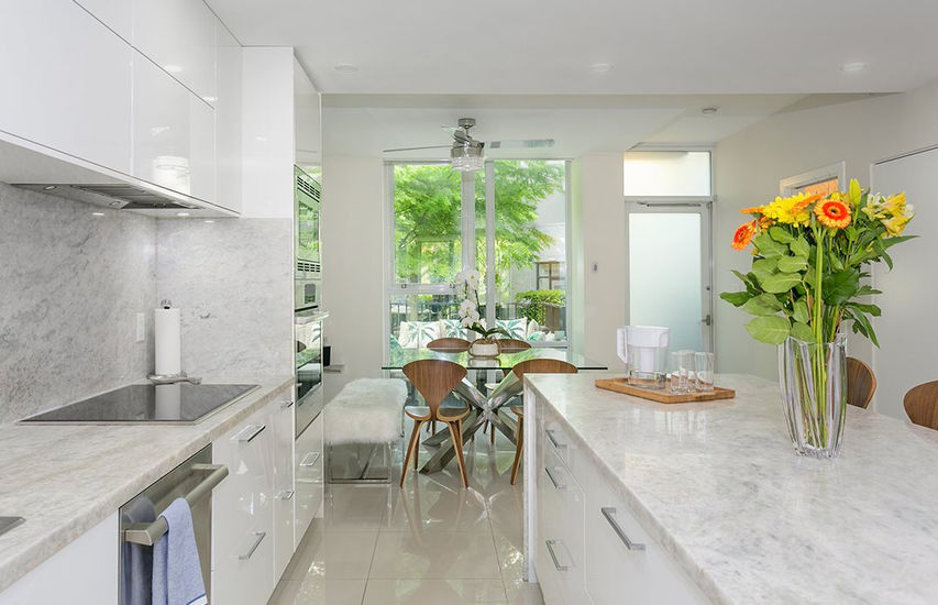 Luxury townhouse in sought after Park West Two. Boasting over 1500 sf, this completely updated unit with open plan over two levels. Bright LR with beautiful chefs kitchen, Bosch SS Appliances, Sub-Zero fridge + terrific pantry, and huge marble island for entertaining! Spacious DR, powder room, and office, plus separate entry w charming rear patio access to playground. Upstairs you'll find a large master suite complete with walk in closet, and spa-inspired en-suite, & private terrace, plus 2 extra bedrooms. World Class amenities has pool, gym, concierge, squash, & much more. All within walking distance to George Wainborn Park, Seawall, Yaletown, Granville Island and new up and coming Vancouver House neighborhood!