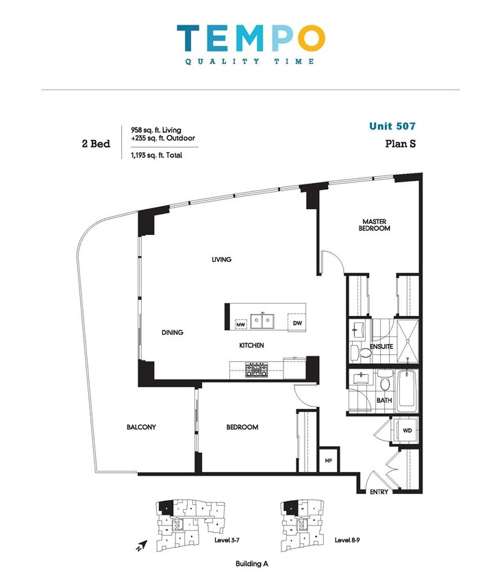 New, bright Southwest CORNER 2 Bedroom home at Tempo. Bright spacious floor plan with large covered 235 sq ft outdoor balcony. Air conditioning, laminate flooring throughout and full-sized kitchen appliances. TWO parking spaces. Deluxe amenity package with indoor pool, fitness centre, dance studio, party kitchen and lounge, as well as concierge service. Concrete construction in fantastic neighbourhood close to transit. Easy to show.