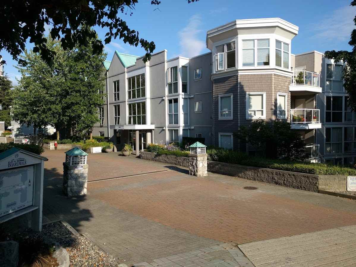 Enjoy view to Fraser River and Mt. Baker from your living room! This well kept, top floor, spacious 770sqft one bedroom plus den (possible 2nd bedroom) unit is in the best building amongst the "Boardwalk" complex. Located in Vancouver River District, which offers amenities such as the river walk, tennis courts, Fraserview golf course and soon to come River District Town Centre. Well cared for complex with beautiful fountains and courtyard, fully rain screened, newer roof, re-piped, guest suites, exercise & party room ect. Unit has gas f/p , in suite laundry and comes with one parking and one storage. Both rentals and pets are allowed with restrictions.