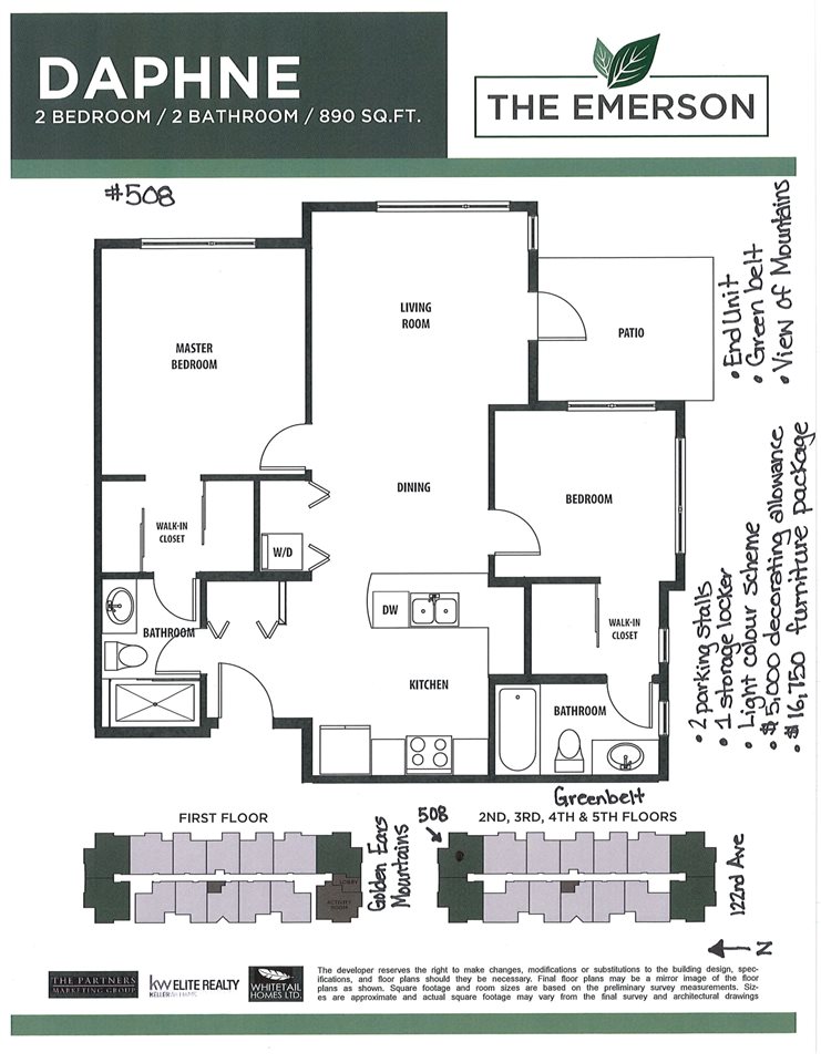 Where Greenbelt living meets suburban splendor! Top Floor unit facing the greenbelt providing the utmost in privacy. The Emerson is an elegant new condo built with quality craftsmanship located close to rivers, lakes, parks and downtown Maple Ridge. Close to shops, restaurants and fitness/community center. This TOP CORNER unit has modern finishings including: stainless steel appliances, quartz countertops, laminate flooring, air conditioning and a large deck with views of the Golden Ears Mountains. This unit comes with 2 parking spots & a storage locker. This is the Light colour Scheme (pics included) and is the coveted Daphne Floor Plan. Assignment also includes a FURNITURE package and a $5,000 decorating allowance! Est. Completion Spring 2019.