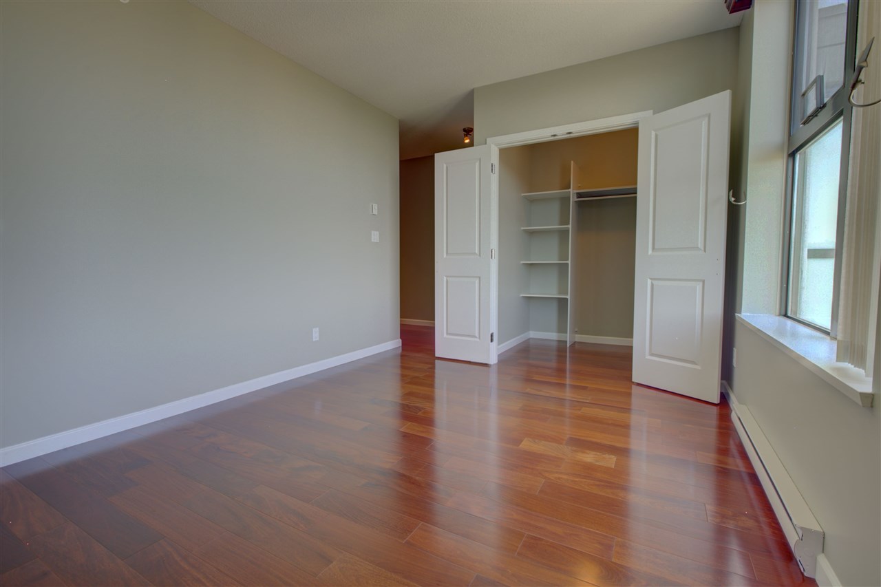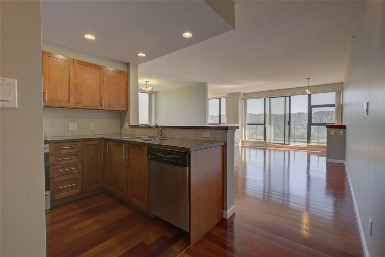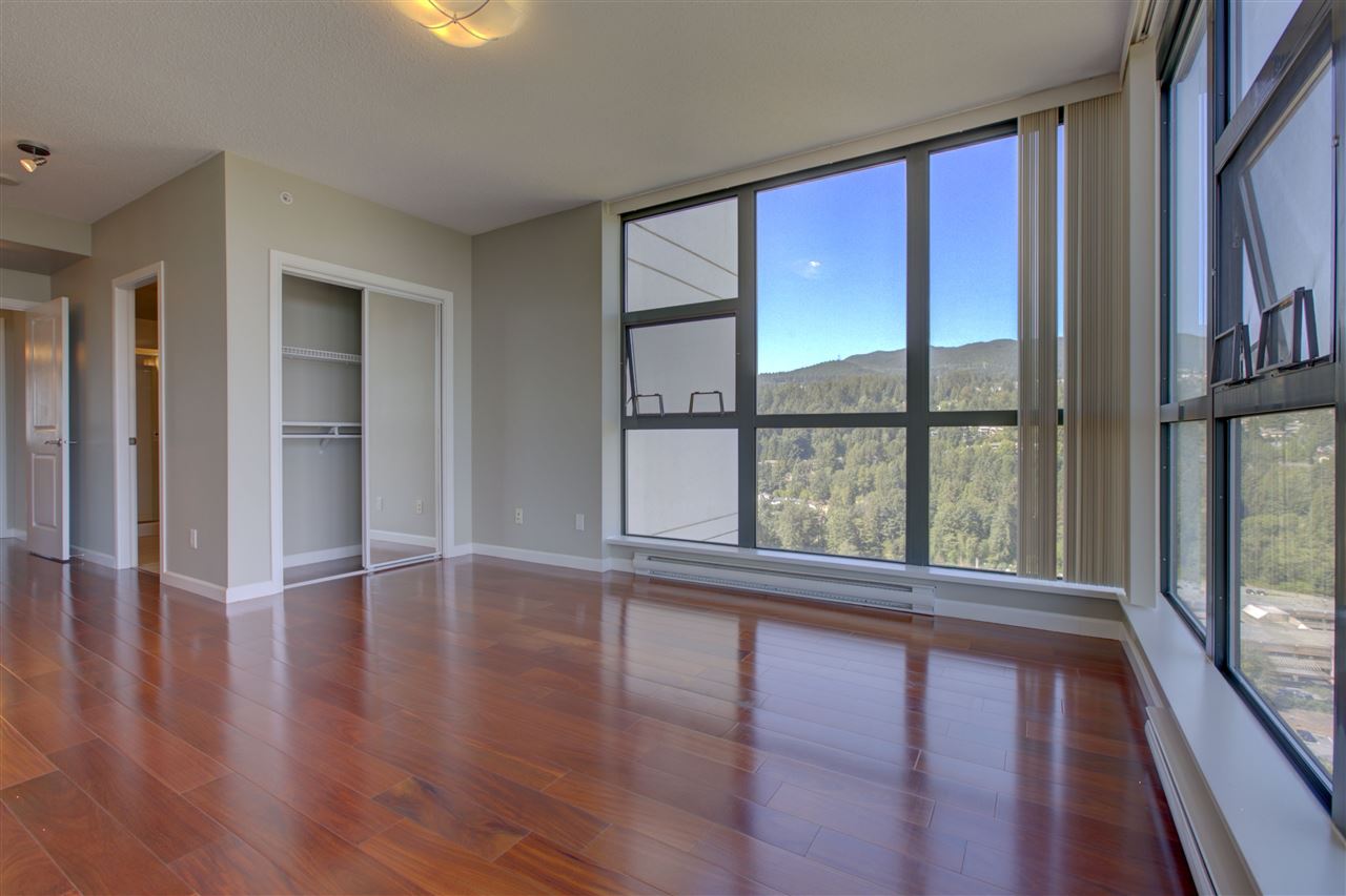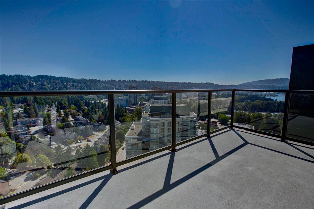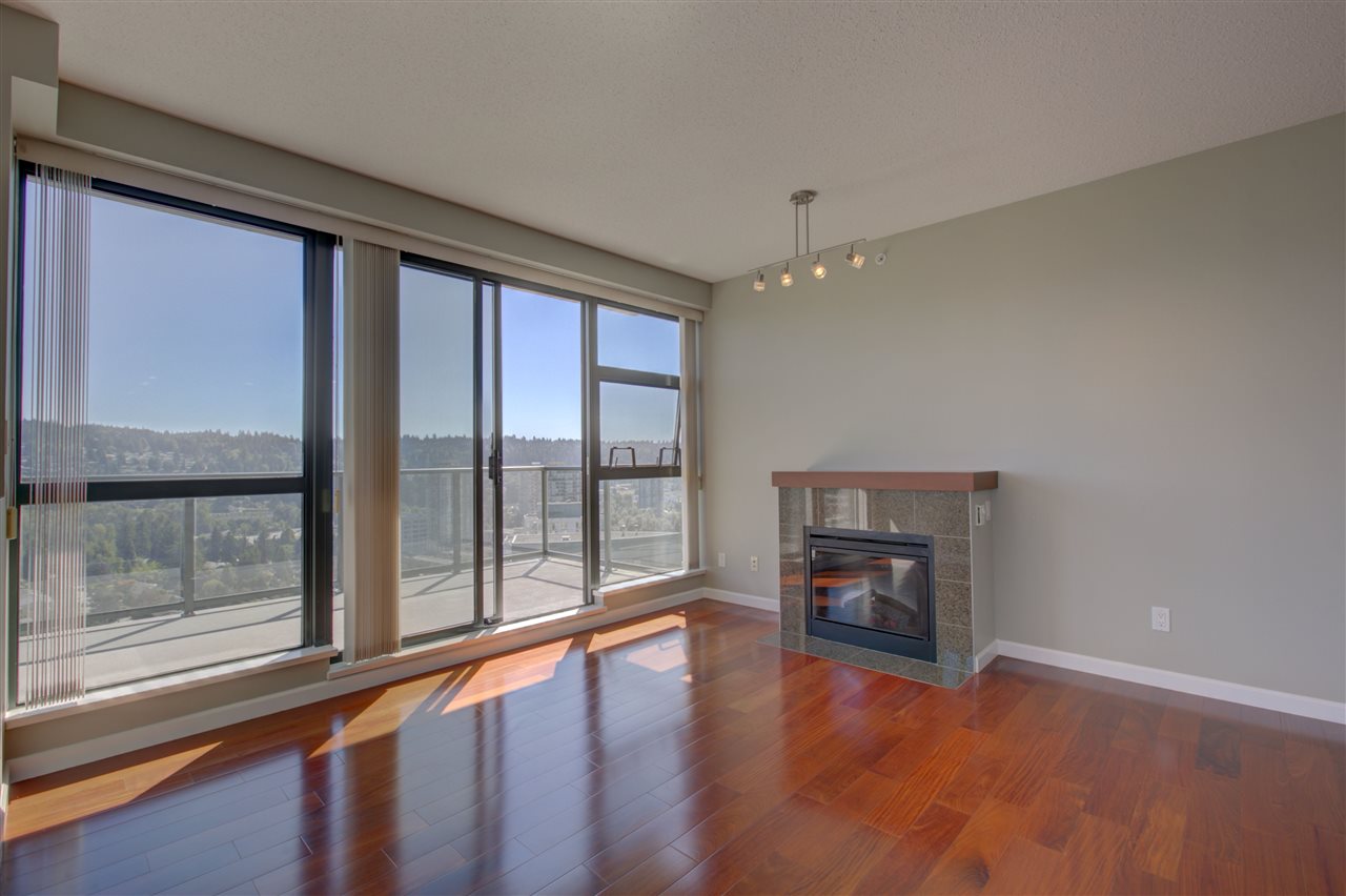 Prestigious penthouse with a stunning 270 degree view of mountains, water and city located in the desirable, well run, elegant and extremely well kept Crescendo concrete building. 2 parking spots side by side, 2 bedrooms, den & 2 full bathrooms, a huge covered balcony, a cozy fireplace in the spac living rm. Real, highest quality hardwood flooring, stainless steel appliances with a brand new oven and microwave. Friendly, open floor plan with a private location of the master bedroom. There are only four suites on the floor, which offers you over 1500 sqft of living space. 9' ceilings make the space look even larger. The kitchen features granite counter tops and wood shaker cabinets. Steps away from the New Port Village, rec centre and library.