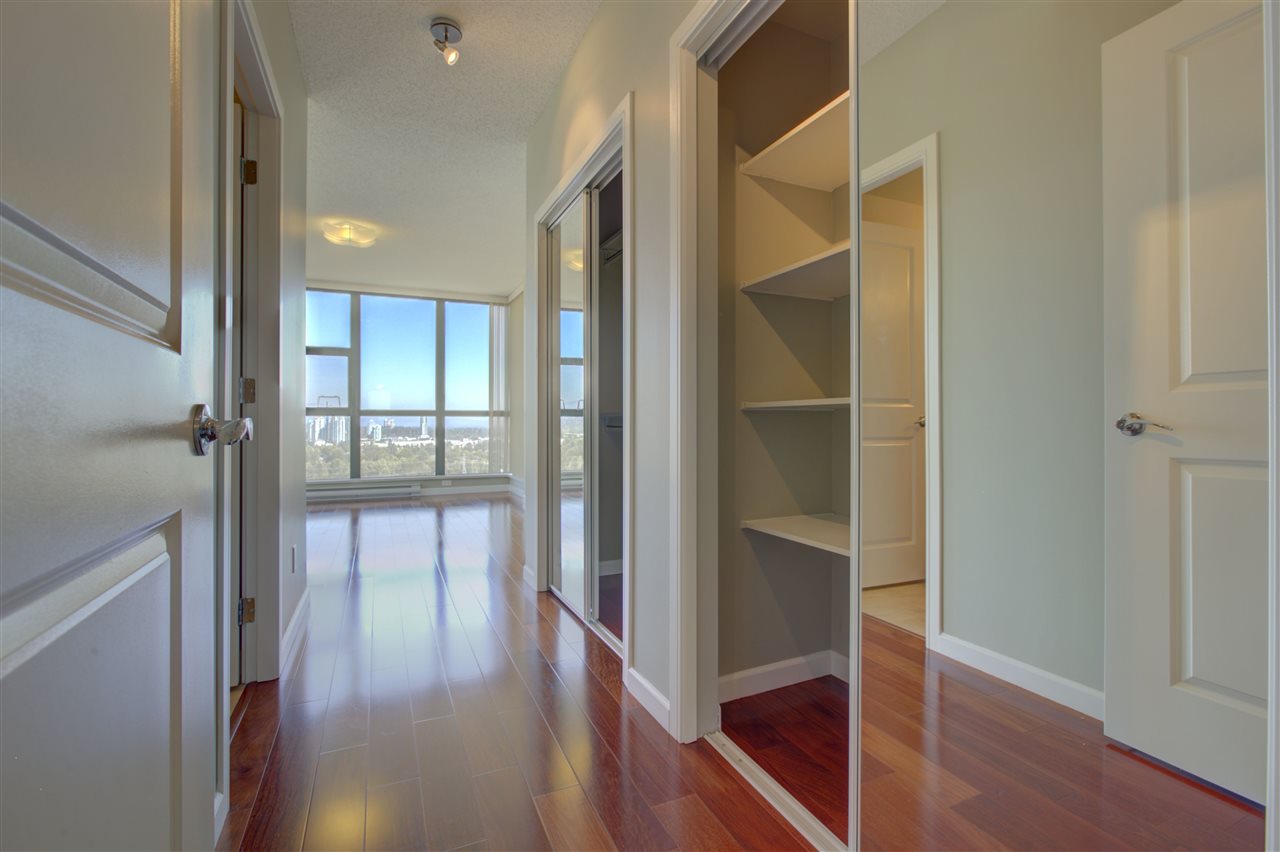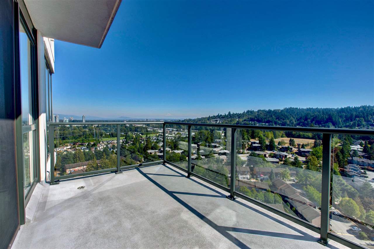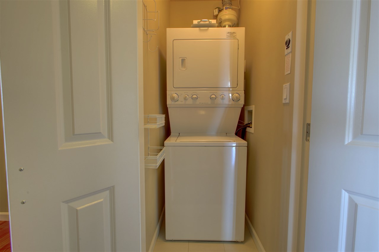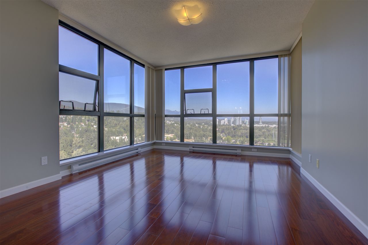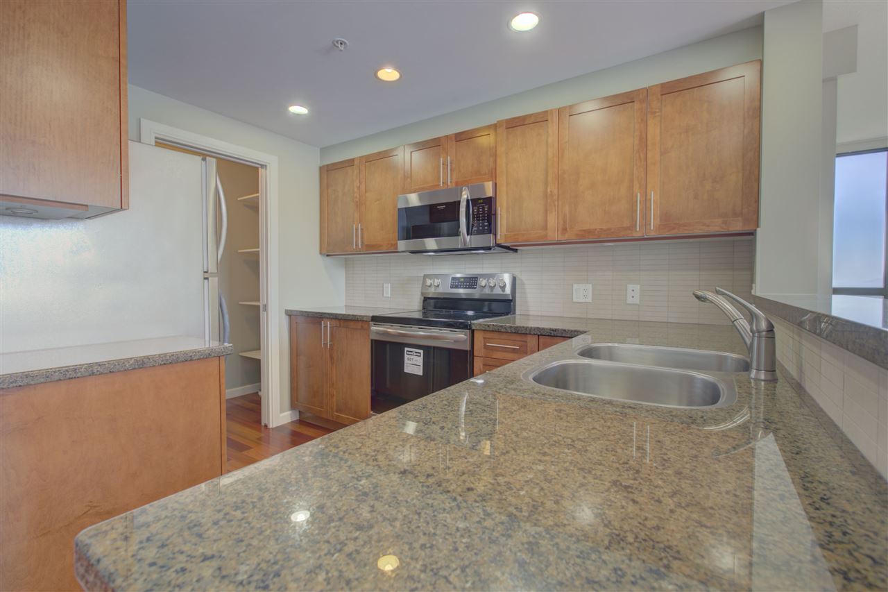 Prestigious penthouse with a stunning 270 degree view of mountains, water and city located in the desirable, well run, elegant and extremely well kept Crescendo concrete building. 2 parking spots side by side, 2 bedrooms, den & 2 full bathrooms, a huge covered balcony, a cozy fireplace in the spac living rm. Real, highest quality hardwood flooring, stainless steel appliances with a brand new oven and microwave. Friendly, open floor plan with a private location of the master bedroom. There are only four suites on the floor, which offers you over 1500 sqft of living space. 9' ceilings make the space look even larger. The kitchen features granite counter tops and wood shaker cabinets. Steps away from the New Port Village, rec centre and library.