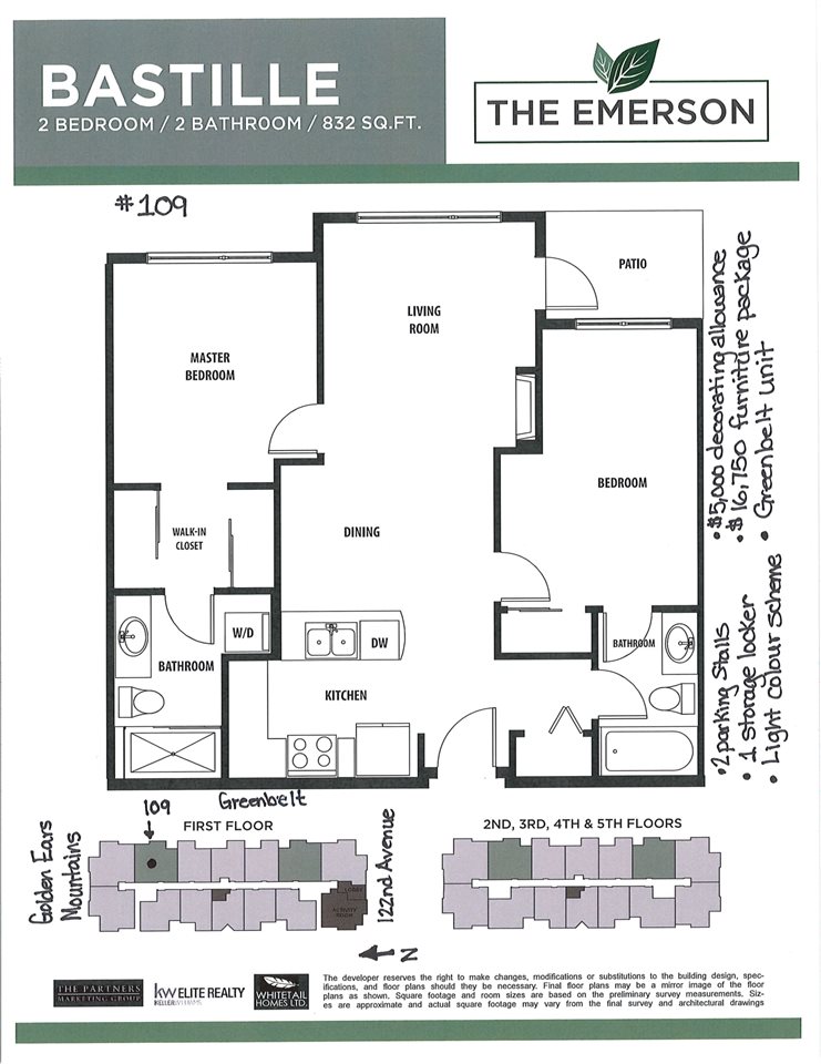 The Emerson is an elegant new condo built with quality craftsmanship located near a greenbelt, rivers, lakes, parks and downtown Maple Ridge. Close to shops, restaurants, and fitness/community centre. This unit is has modern finishing’s including: stainless steel appliances, Italian granite, laminate flooring, air conditioning, 2 parking stalls ,storage locker. and comes with spacious patios. Unit comes with 2 parking stalls and a light colour scheme. Estimated Completion Spring 2019. Unit comes fully furnished ($16,750) and a $5,000 decorating allowance.