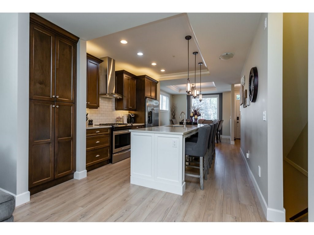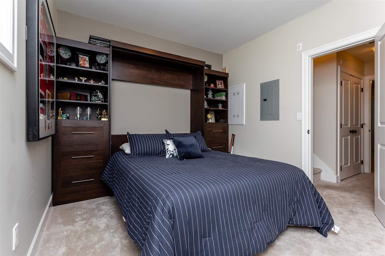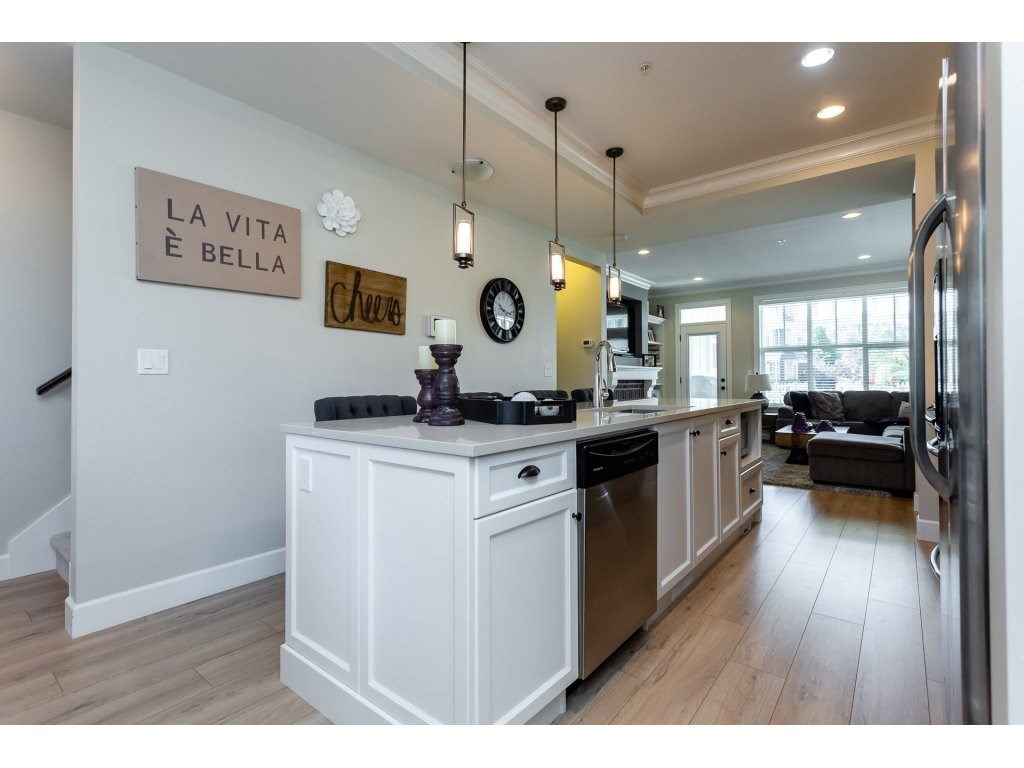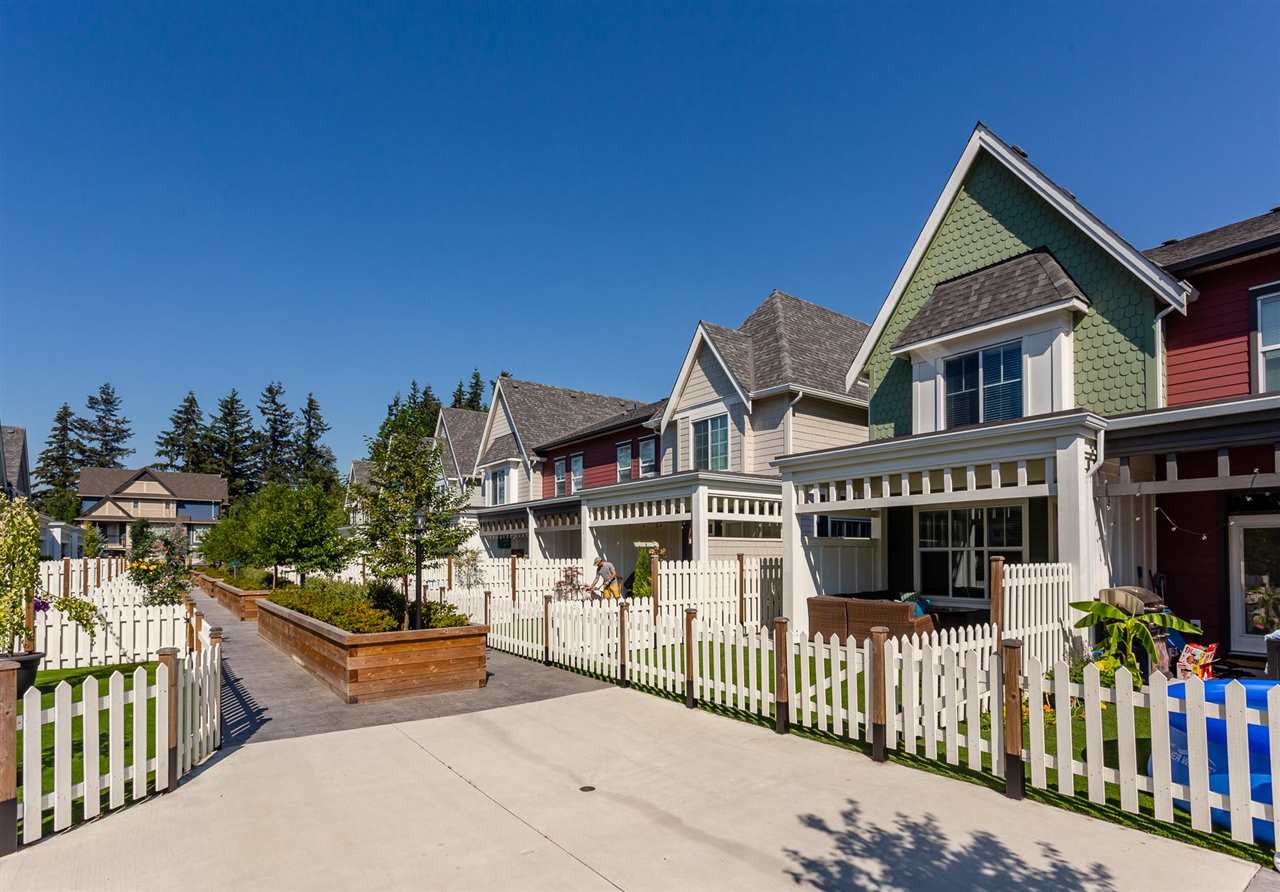 Sought after Brixton Station in Garrison Crossing! Beautiful open concept, end unit townhome with a ton of extras! This 3 bed, 3 bath, 3 level professionally decorated home has a gourmet kitchen with hardwood cabinets, stone counters, custom pantry and stainless steel appliances. The massive island will fit the whole family for those all important gatherings. Extras include a built in dresser in the master, built in murphy bed in the basement, and shelving in the family room. Fully fenced, south facing back yard with high quality artificial grass. Two underground parking spots with direct access into the fully finished basement. Walk to the shops, restaurants, pubs, community rec centre w/pool, the Veddar River and more!