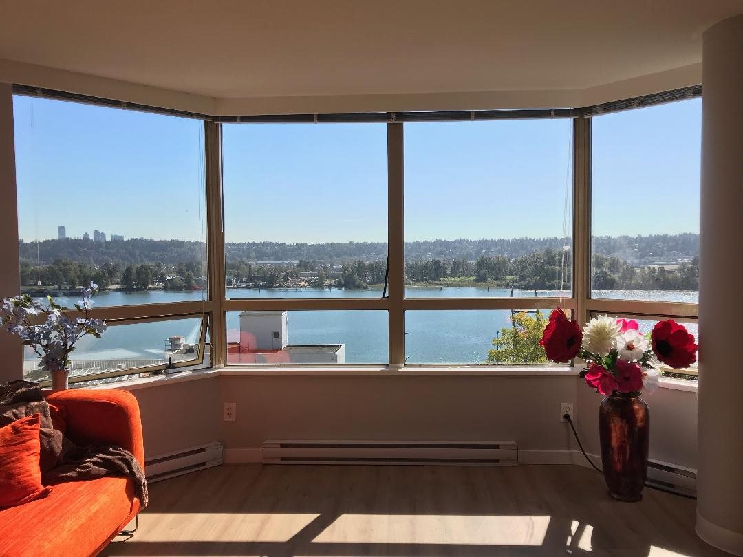 Rarely available D/T New Westminster SOUTH facing 2 bedroom 2 bath 946 sqft unit. Rain Screened Building. Separated bedrooms, separated kitchen, one locker, one parking. With 270 degree beautiful river view, it is freshly renovated with new kitchen cabinet, granite counter top, SS appliance, all new laminate floor, new painting, new baseboard heaters, controls, skytrain station just cross street, the Pier Park, lots of nice restaurants a step away, this is a place you can called home sweet home! Don't let the opportunity go! Open house Sat. Dec. 8 2-4 pm