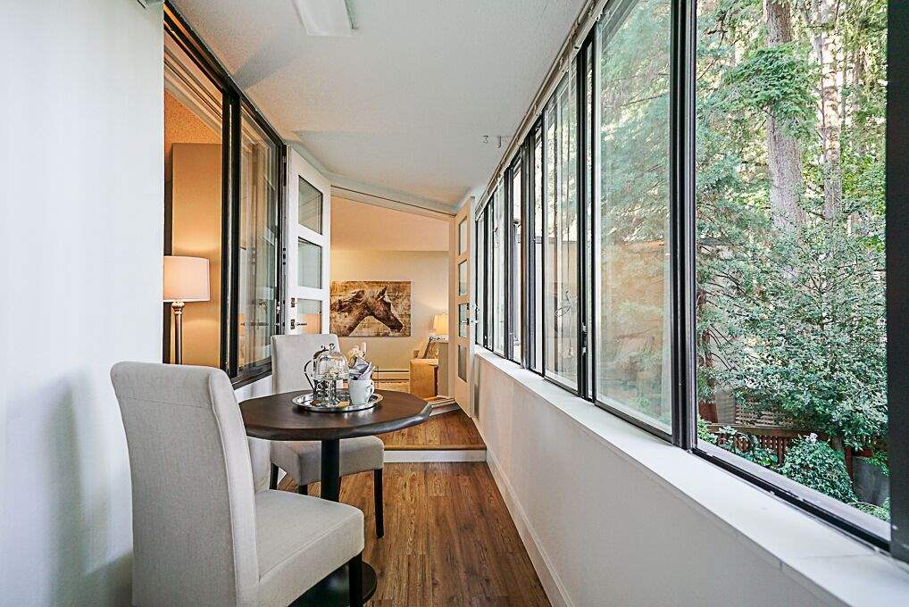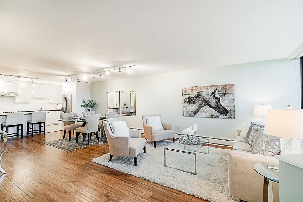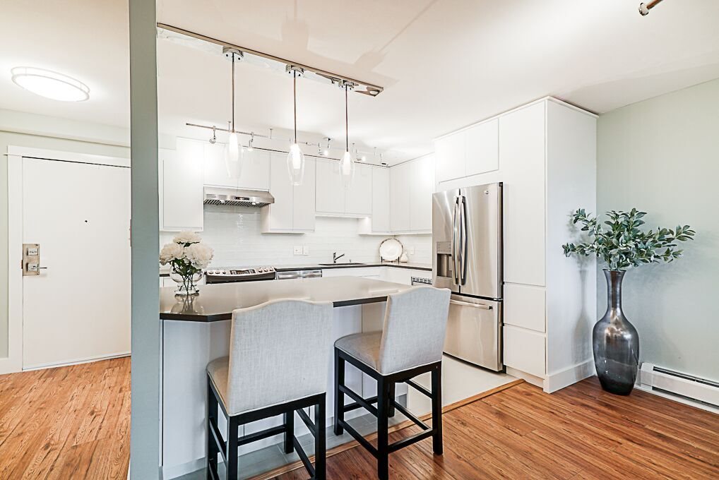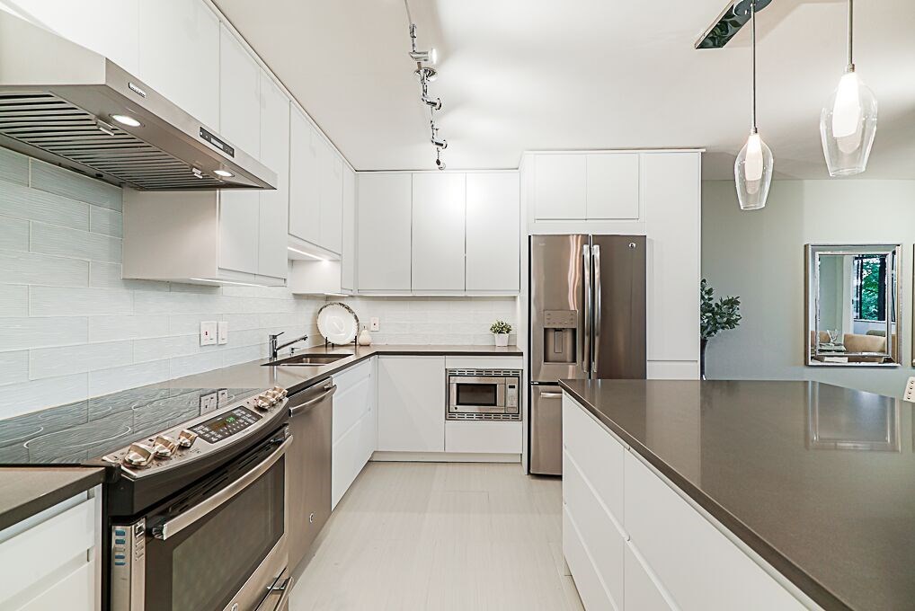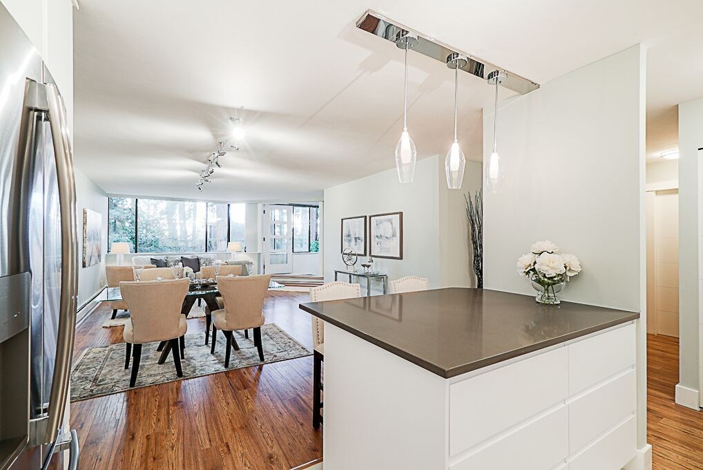 Recently Reduced Price. Luxury adult living in the heart of White Rock. Completely renovated & Move in Ready! This concrete building is just steps away from shopping, dining and amenity needs. Featuring designer paint colors and designs with ceramic tiles and low maintenance laminate flooring throughout. Spa like bathrooms with modern designs and fixtures. The kitchen is a gourmet's delight with stainless steel appliances, quartz counter tops, custom glass tile backsplash and extensive cupboards. Enjoy open concept living with a formal dining room and living room large enough to accommodate all of your full size furniture. Spacious Master Suite with California closet, en suite and stunning French Doors leading to the sun room. Ease of in suite laundry. Vendor open to reasonable offers
