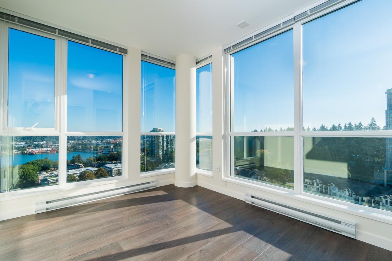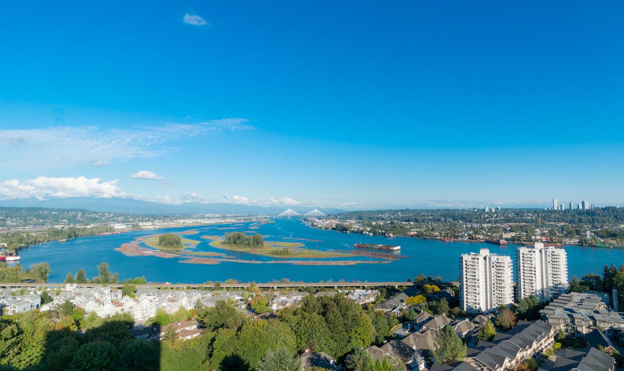 This SW corner unit w/2 bed, 2 bath, den, insuite storage close to 1100 sf is meticulously maintained and shows like new. Quartz countertops, s/s appliances, wide plank oak hardwood floors, heated floor in 4 pieces ensuite. Efficient & spacious open concept layout. Floor to ceiling windows for overwhelming natural light & gorgeous views of Fraser River, Queen's Park & Mt. Baker. Good sized den is away from main living area for seclusion and solitude, ideal for entertainment and quiet study. 7 days a week concierge, guest suite, pool/hot tub, gym, yoga room, party room, theatre, bike room. A short stroll to peaceful Glenbrook Ravine Park and Queen's Park. Catchment area for one of the best secondary schools being rebuilt for Sep 2020. 1 min walk to bus stop. 1 parking & 1 storage.