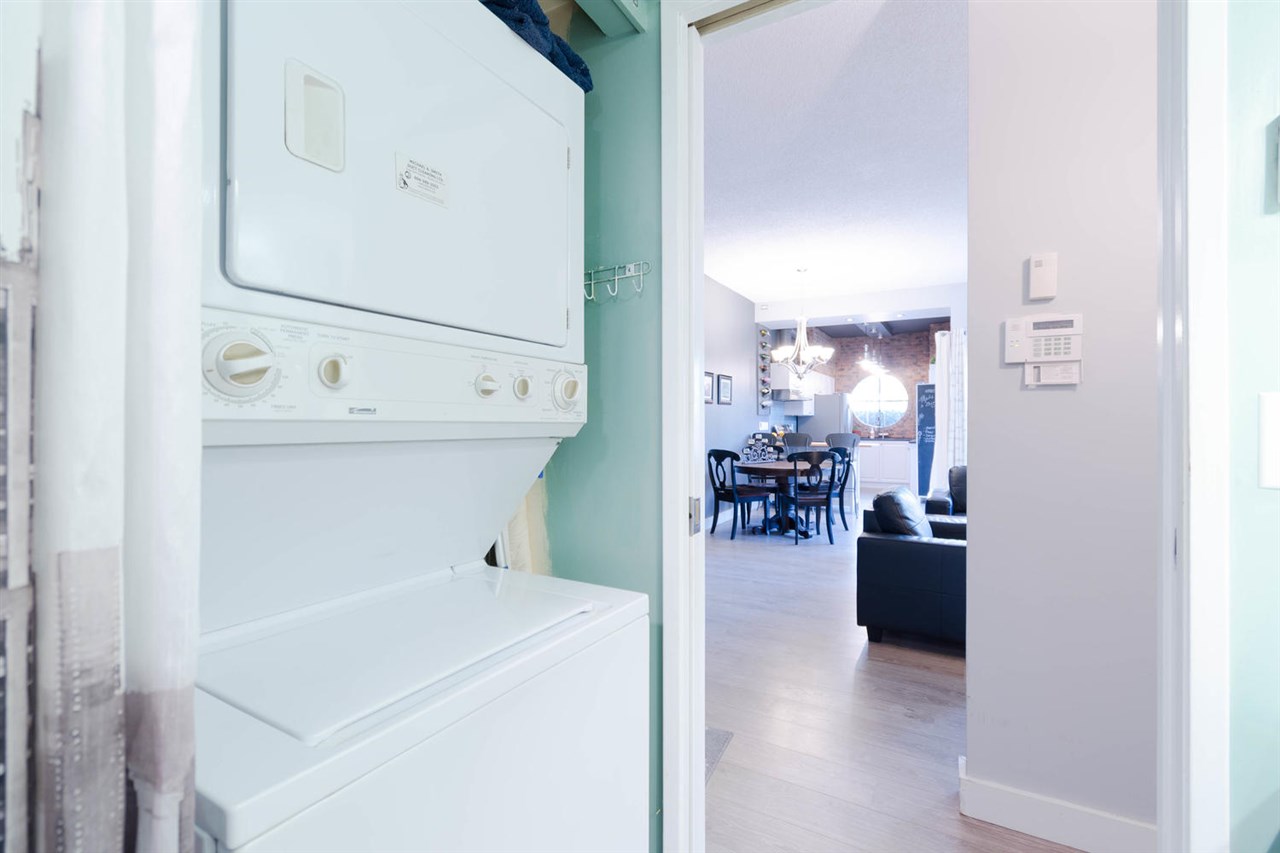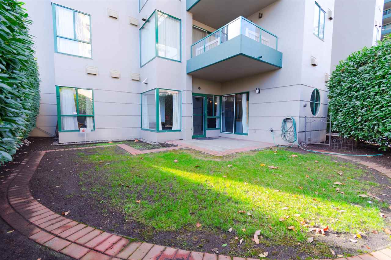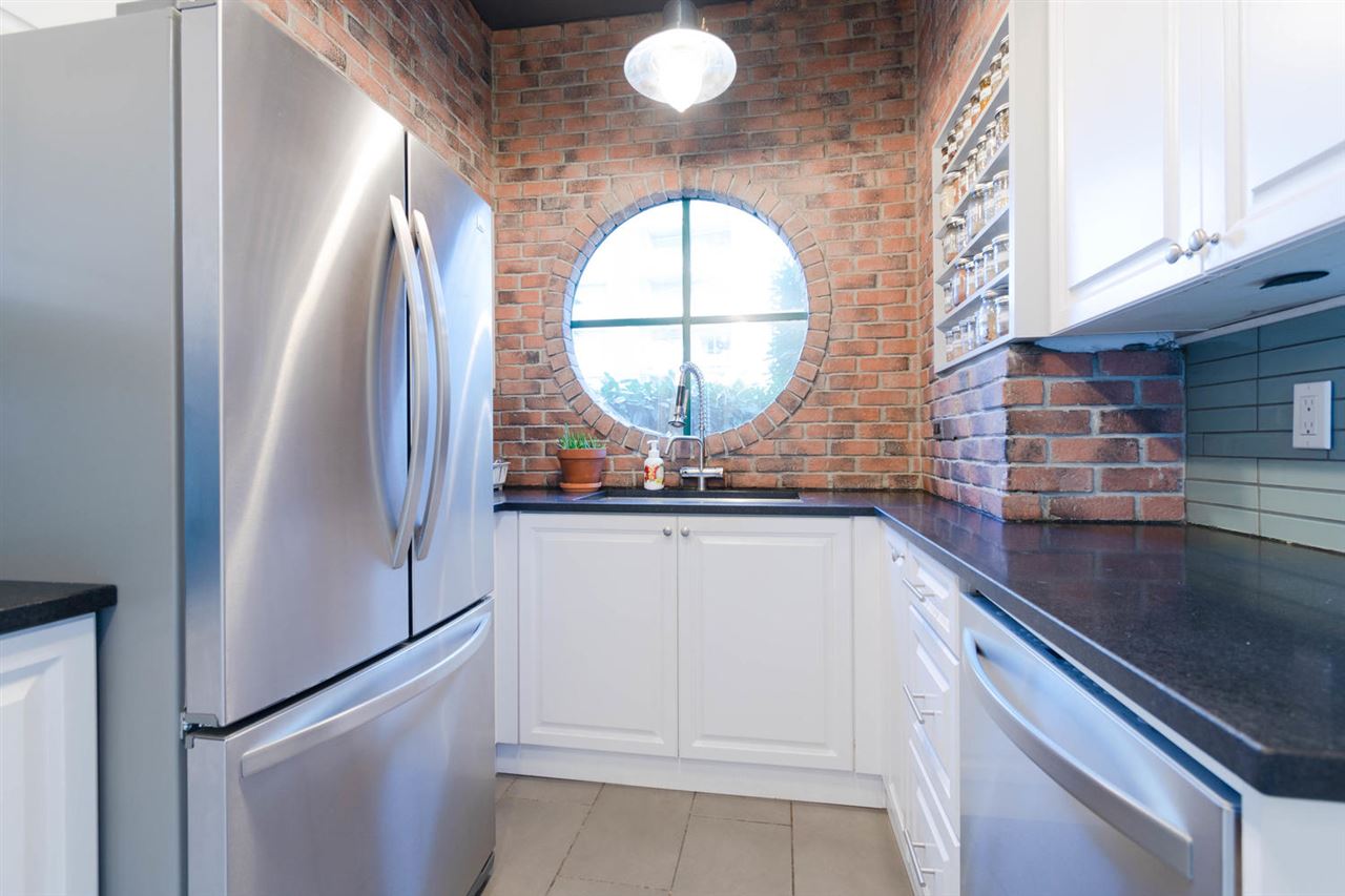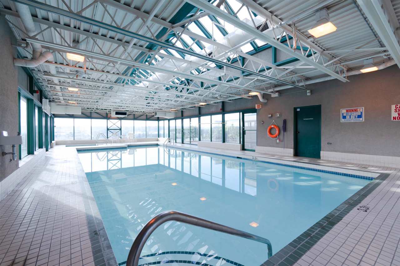 Entertainment style home with 1,065 sqft, 2 bedroom, 2 bath ground level corner unit in concrete highrise has really unique qualities. 10 ft ceilings, engineered hardwood floors throughout, updated kitchen with newer cabinets & exposed brick feature & heated floors. Large living room/dining room combo with gas f/p and open space for desk. Master bdrm with ensuite, 2nd bdrm, 3pc bath incl. washer/dryer & Security System. Unit has huge private garden & patio. Swimming pool w/hot tub, Sauna Gym, Library, common area courtyard, large common area deck with views of the River. Steps to Columbia Skytrain Station with access directly from within bldg, walk to restaurants, pubs, shops, movie theatres, Pier Park, New West Quay. Rentals allowed