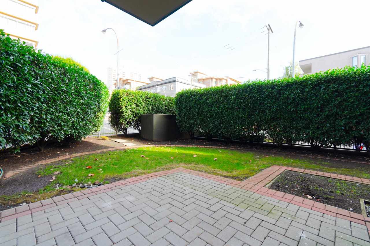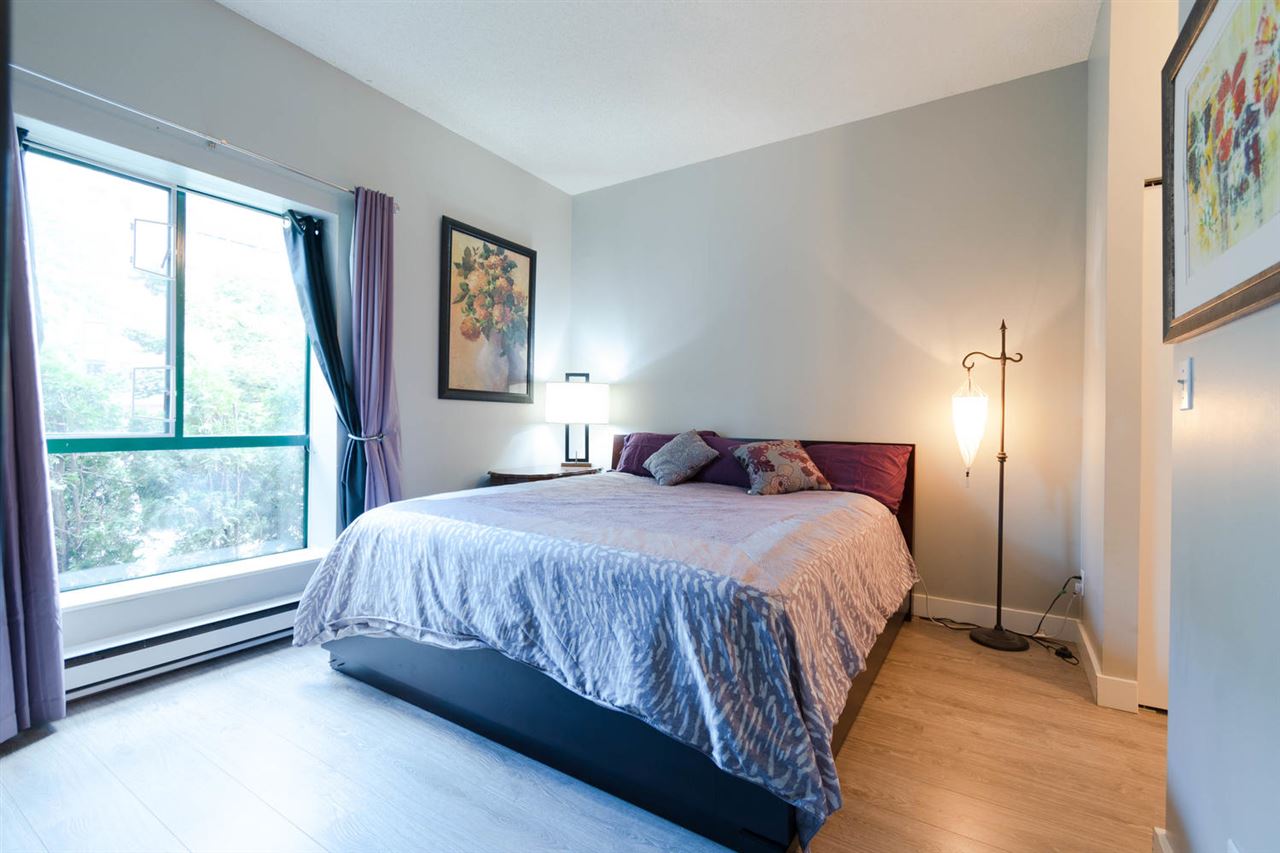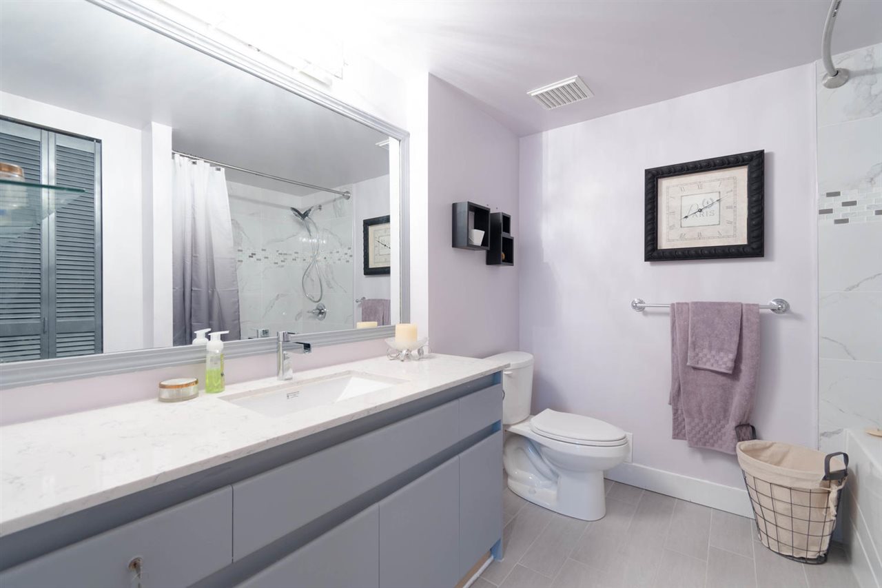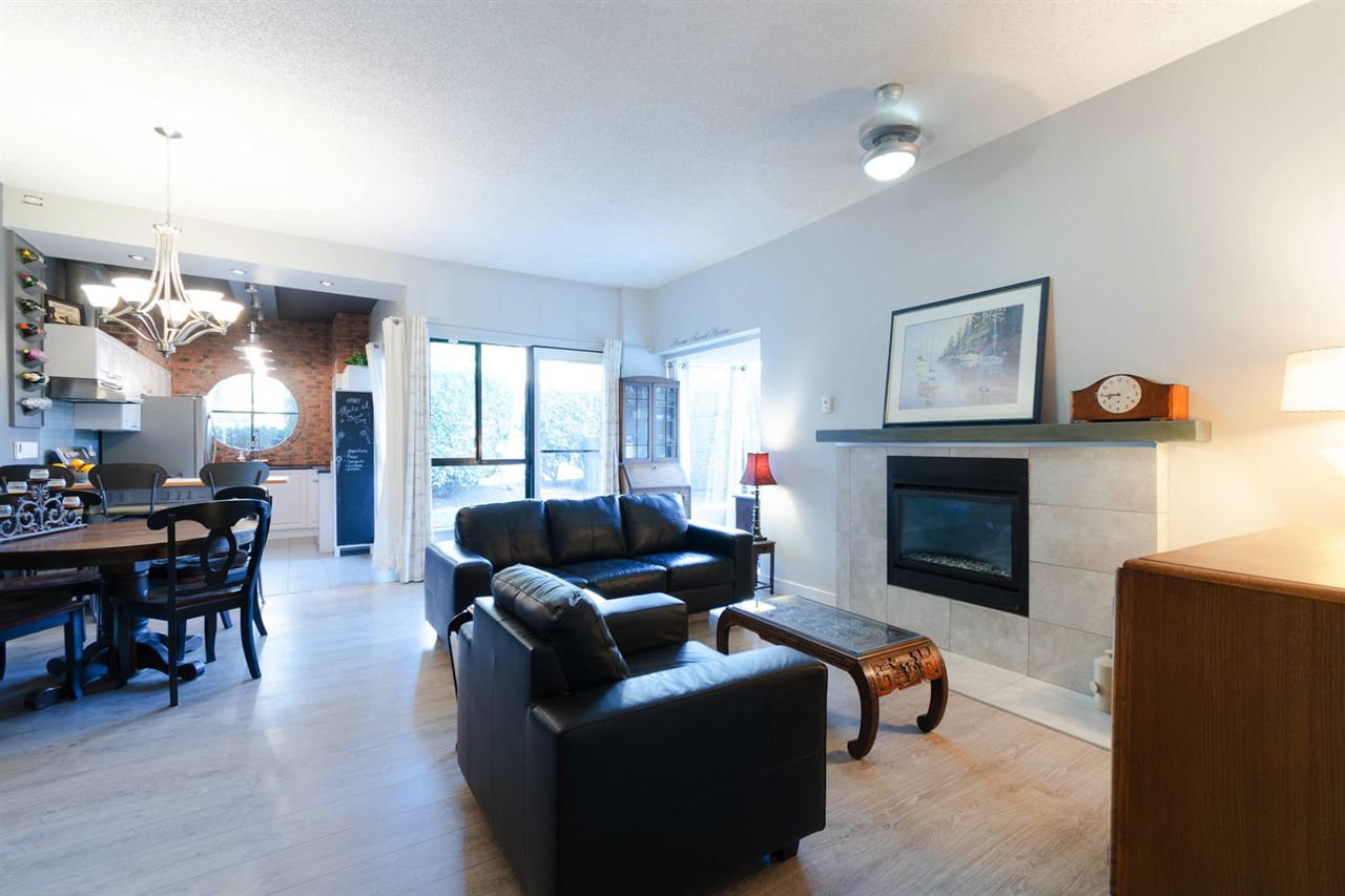 Entertainment style home with 1,065 sqft, 2 bedroom, 2 bath ground level corner unit in concrete highrise has really unique qualities. 10 ft ceilings, engineered hardwood floors throughout, updated kitchen with newer cabinets & exposed brick feature & heated floors. Large living room/dining room combo with gas f/p and open space for desk. Master bdrm with ensuite, 2nd bdrm, 3pc bath incl. washer/dryer & Security System. Unit has huge private garden & patio. Swimming pool w/hot tub, Sauna Gym, Library, common area courtyard, large common area deck with views of the River. Steps to Columbia Skytrain Station with access directly from within bldg, walk to restaurants, pubs, shops, movie theatres, Pier Park, New West Quay. Rentals allowed