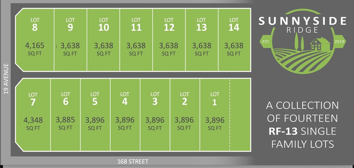 New subdivision of 13 RF13 lots that will accommodate 2 storey (plus basement) homes. Highly coveted South Surrey location in prime Grandview Heights neighborhood close to Southridge Private School and walking distance to the future Grandview Heights elementary (2 blocks away) and secondary schools, set to open in 2020. Minutes to Morgan Crossing, Grandview Corners, Grandview Heights Aquatic Centre. Builders will be required to follow a statutory building scheme/design guideline