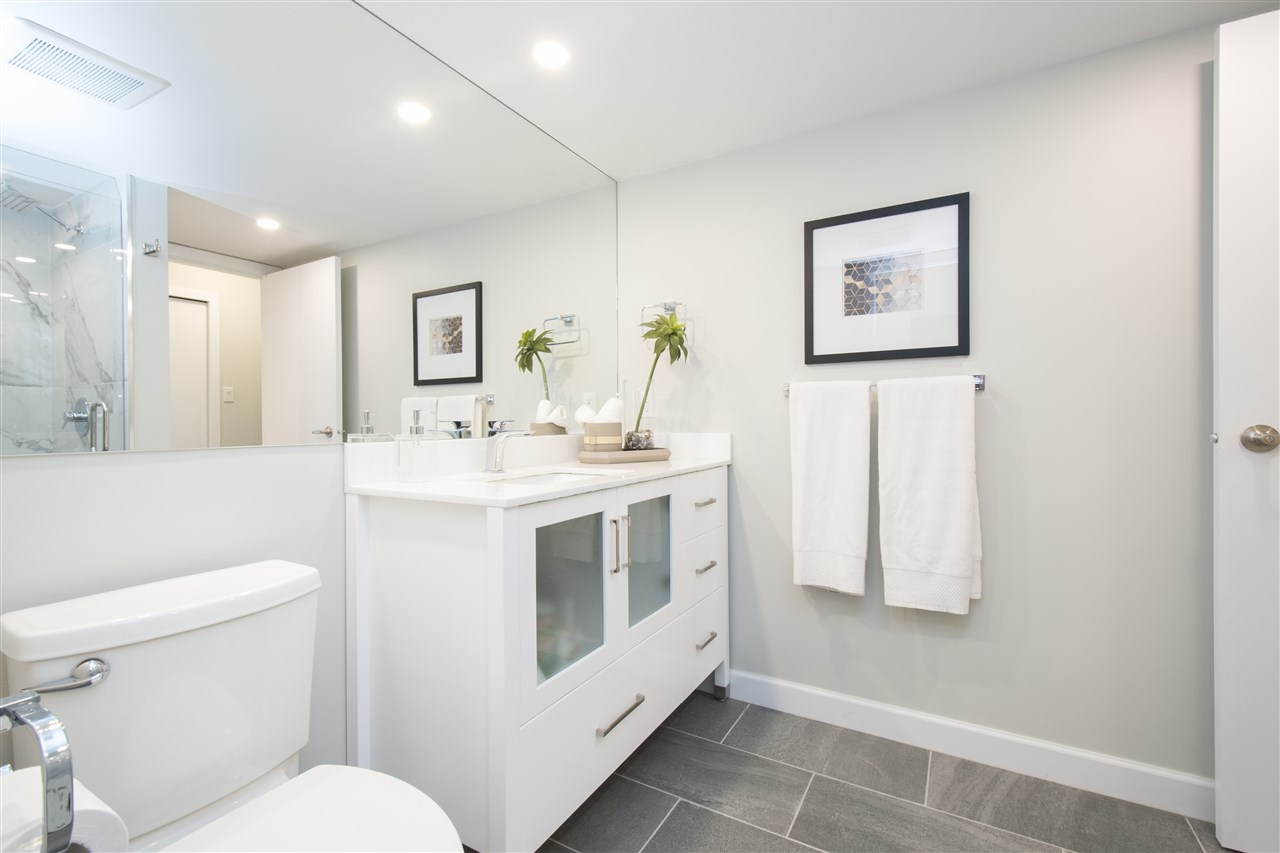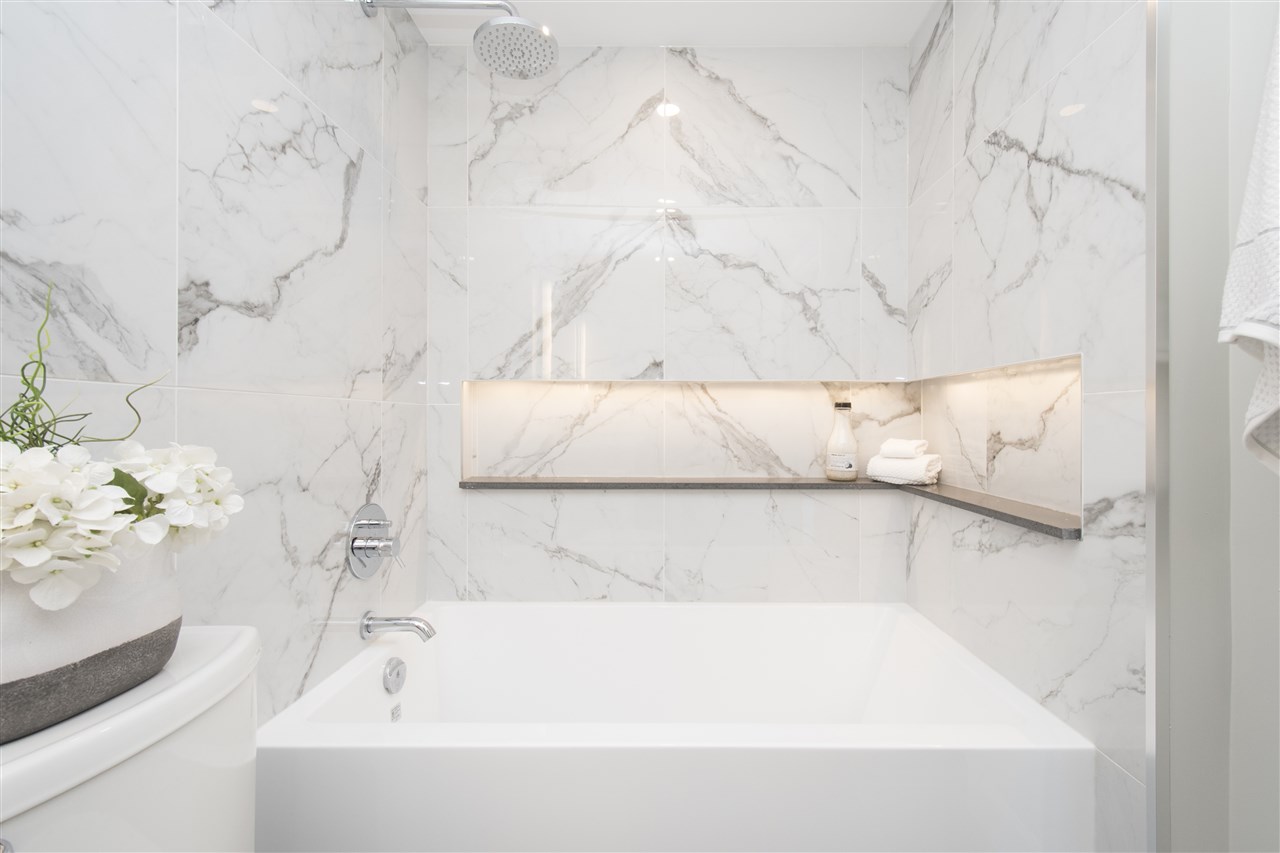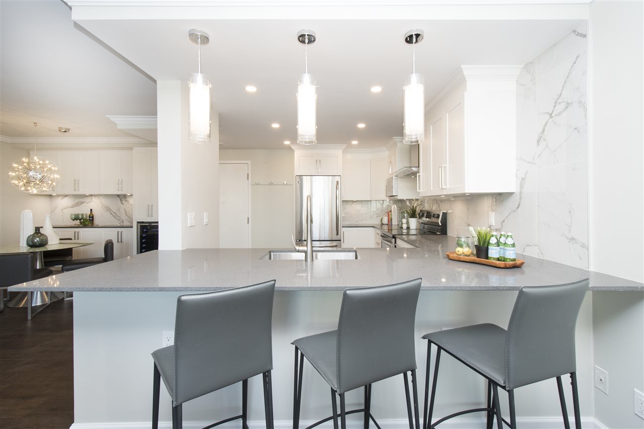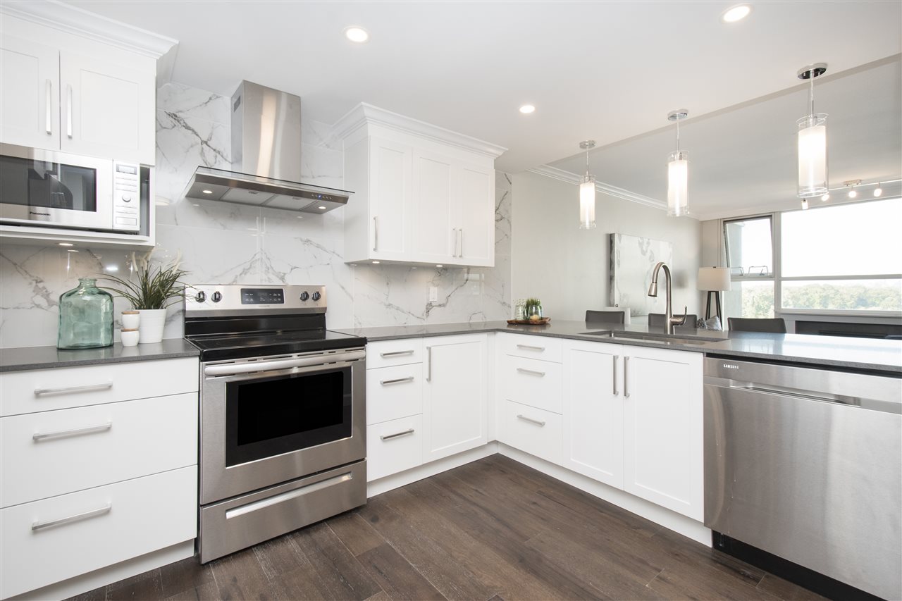 Welcome to the Promenade! This open plan two bed/two bath condo in the amazing Quayside neighbourhood offers over 1,000 Sq Ft of fully renovated living space with custom built-ins, chefs kitchen, beautiful hardwood floors and great views! This unit is great for entertaining with its open floor plan and large outdoor space with enough room to soak up the evening sun with your friends and family. The building has great amenities that include a pool, hot tub, sauna, gym, lounge, bike room and there is a brand new park right beside the building. With local shops and transit right around the corner, this is the place you want to be. Work done to the building includes rain screening, re-piping, new elevators, and a new roof. Don't miss this one!