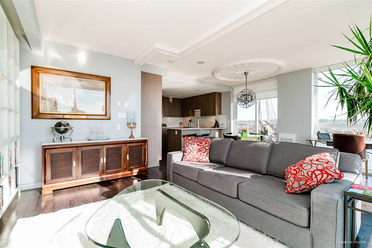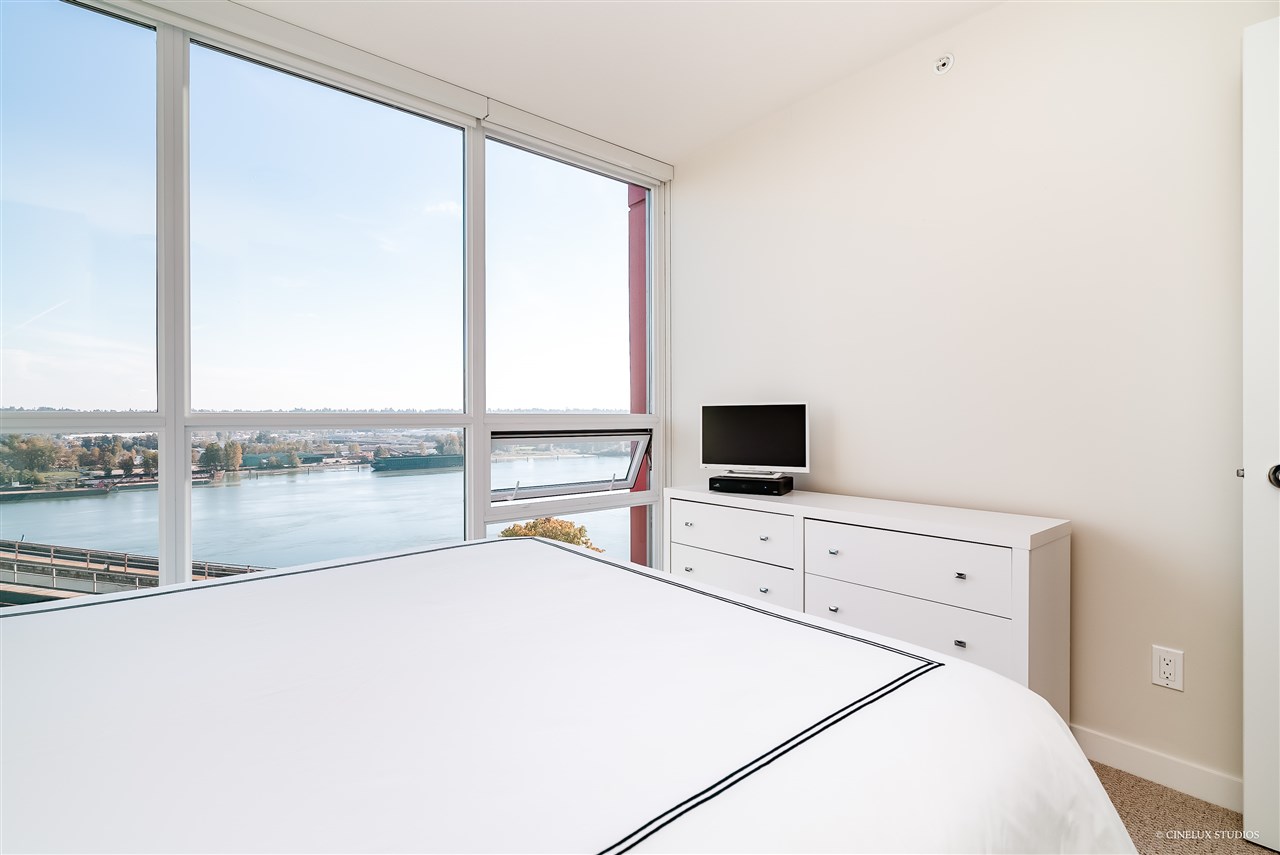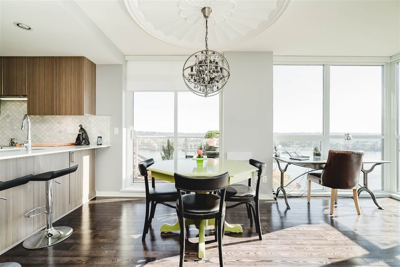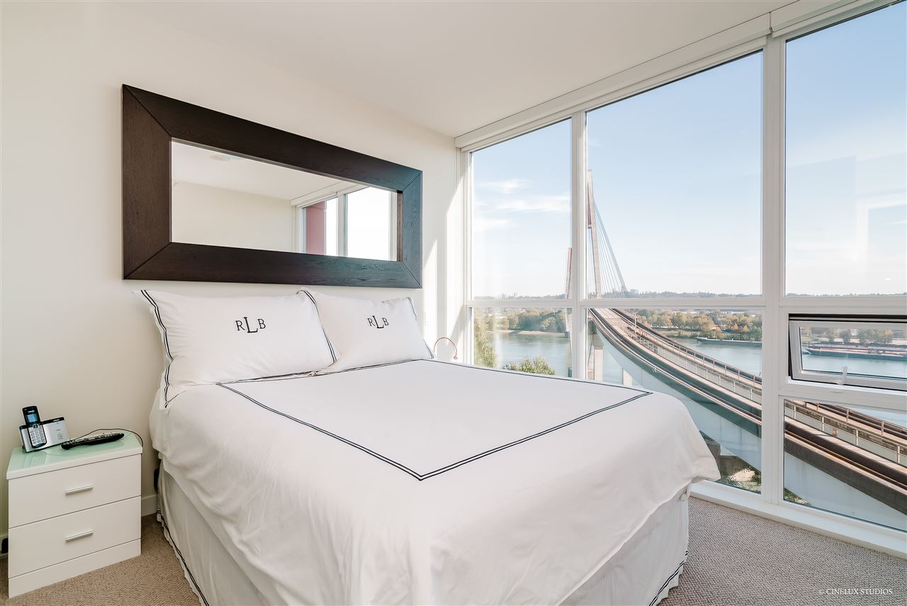 Desirable building - Northbank high rise. 2 bedroom 2 full bath 839 sf Southwest facing CORNER suite has WATER VIEWS in every room. Like new condition, featuring marble and granite front entry flooring, hardwood floor overall, Sculpture 72" ceiling medallion, kitchen upgrades with marble and Moroccan tile back splash, soft close cabinet doors& drawers, upgraded living room space with built in book case and entertainment unit. Open concept design with a fabulous/spacious kitchen area + floor to ceiling glass windows. Rental + pet friendly building. Also includes 1 tandem size parking stall & 2 lockers for $10/month. Located just blocks to Skytrain station, easy access to shopping and restaurants. **OPEN HOUSE THIS WEEKEND SAT & SUN DEC 8 & 9 12:30-1:30pm **