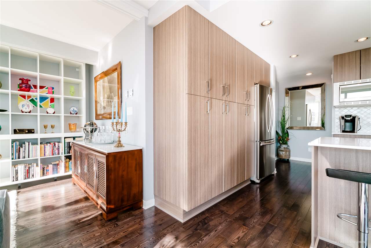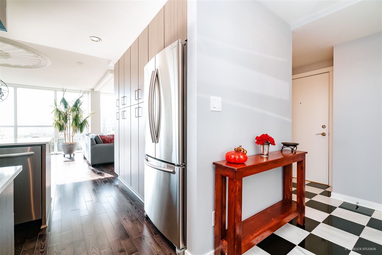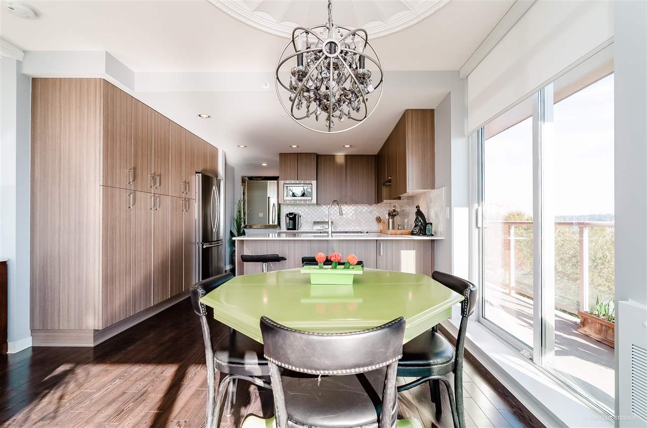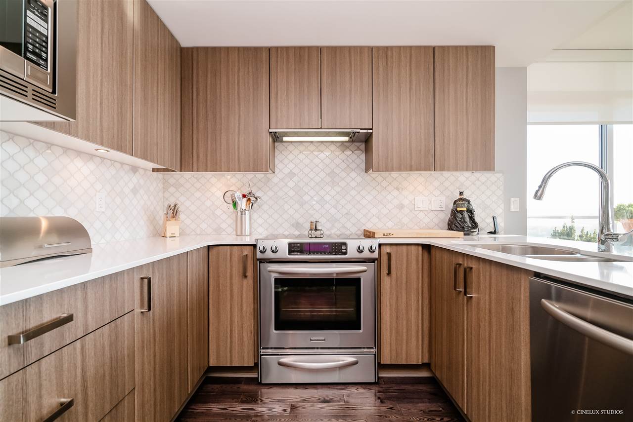 Desirable building - Northbank high rise. 2 bedroom 2 full bath 839 sf Southwest facing CORNER suite has WATER VIEWS in every room. Like new condition, featuring marble and granite front entry flooring, hardwood floor overall, Sculpture 72" ceiling medallion, kitchen upgrades with marble and Moroccan tile back splash, soft close cabinet doors& drawers, upgraded living room space with built in book case and entertainment unit. Open concept design with a fabulous/spacious kitchen area + floor to ceiling glass windows. Rental + pet friendly building. Also includes 1 tandem size parking stall & 2 lockers for $10/month. Located just blocks to Skytrain station, easy access to shopping and restaurants. **OPEN HOUSE THIS WEEKEND SAT & SUN DEC 8 & 9 12:30-1:30pm **