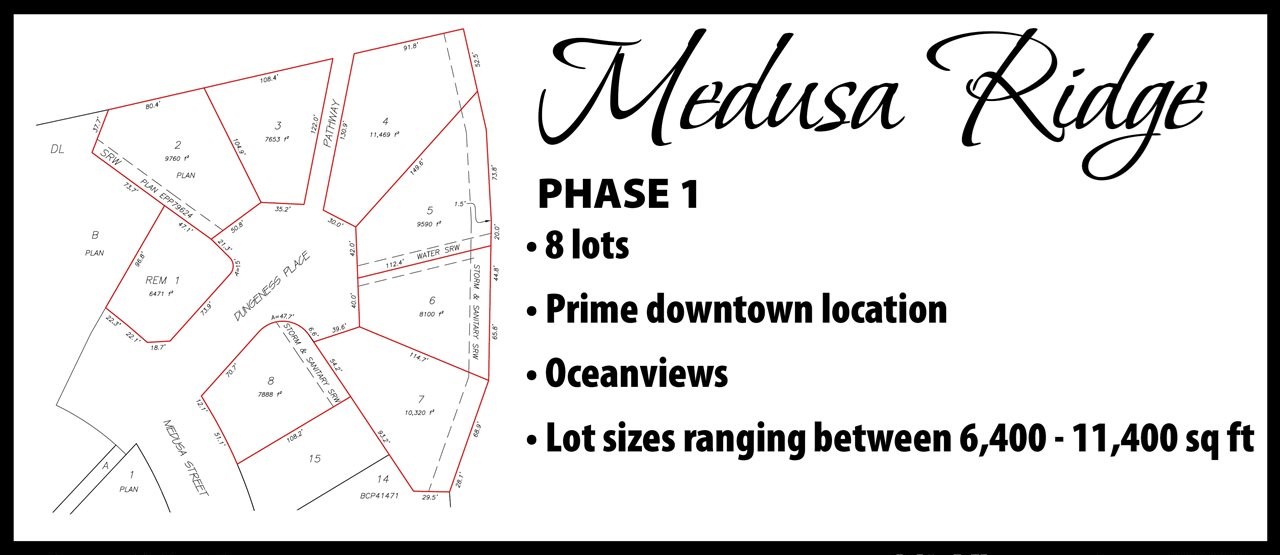 Lot 3 at “Medusa Ridge”. A rare opportunity to purchase a sunny oceanview lot with southern exposure in downtown Sechelt. Build your dream home on this fully service 7,653 sq ft lot. This prime location is a short walk to all the amenities in downtown Sechelt. Enjoy the conveniences of the nearby shopping mall, rec centre with swimming pool, public library, transit, or a walk along the picturesque seawall. Also a kid friendly neighbourhood, close to Hackett Park and across the road from Chatelech high school. Zoning allows for a secondary suite or a home occupation. Building scheme in place.
