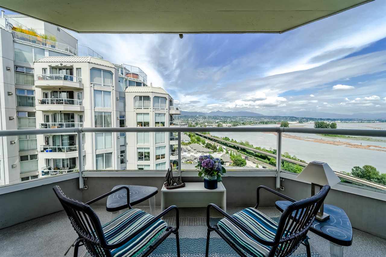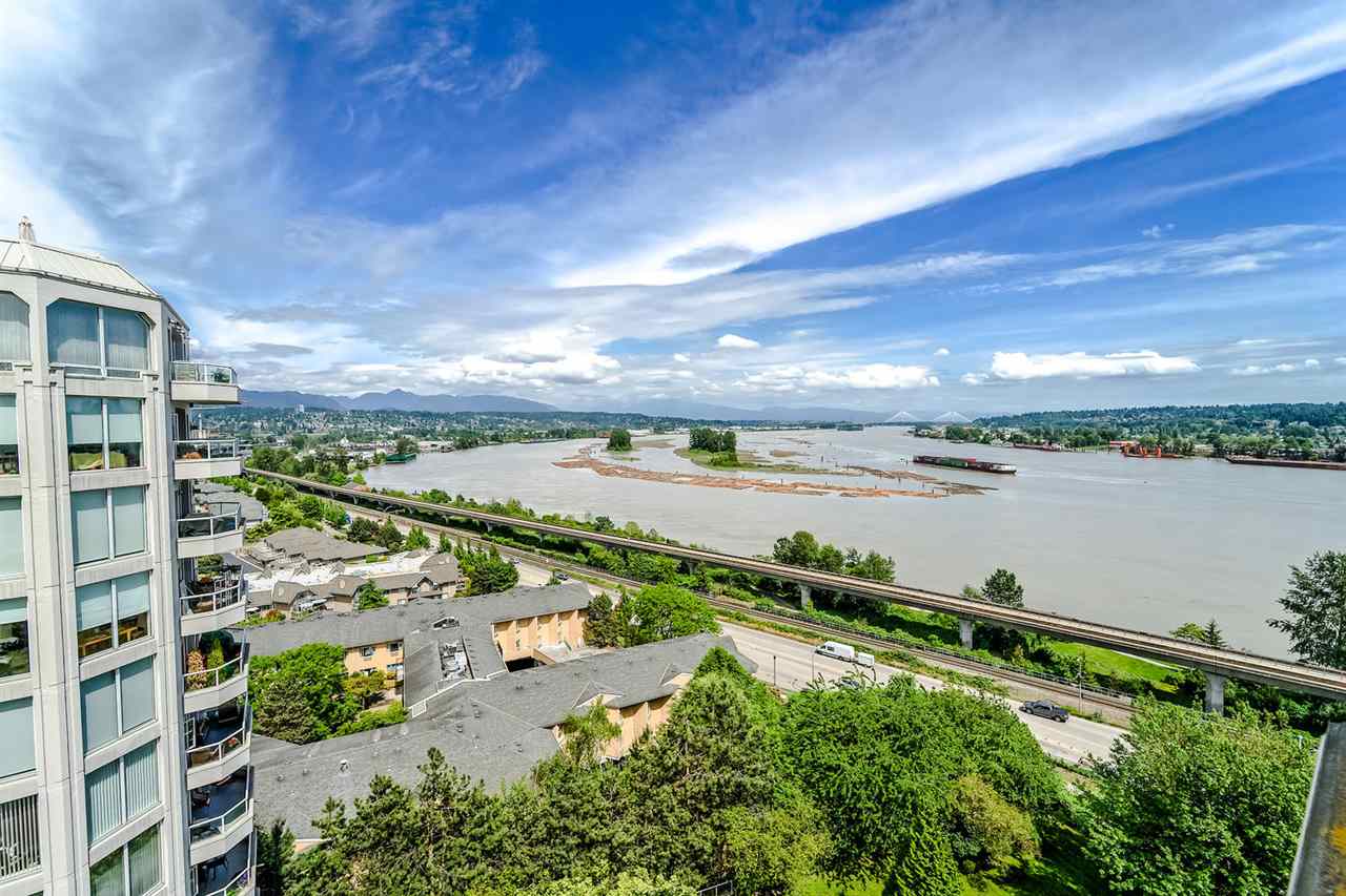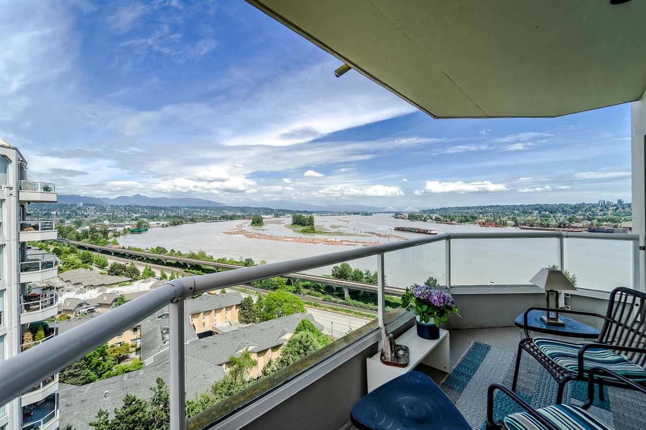 Welcome to the Palace Quay, a concrete building by Bosa & 1 of New West's best kept secret! Stunning view to the Fraser & mountains from 1 or 2 balconies or from the comfort of your living room w/floor to ceiling windows that brings in the natural light. This spacious end unit boasts over 1340 sq w/3 bedrooms, 2 updated baths w/granite counters + engineered HW thruout. Gas F/P incl in strata fees. The huge kitchen has access to balcony + insuite laundry. Convenient location - walk to the Royal Crown Castle Pub or short ride to Canada Games Ctr & Queen's Park. Excellent maintaining of this building that was re-piped in 2001, exterior painting in 2012 + newer roof. Fab amenities w/an I/D pool, gym, sauna, hot tub & bike room.