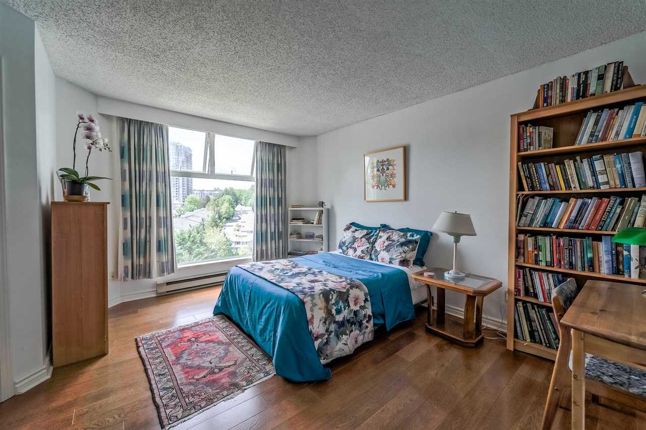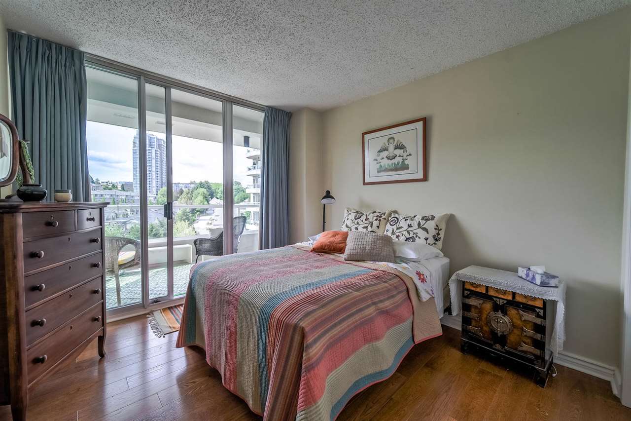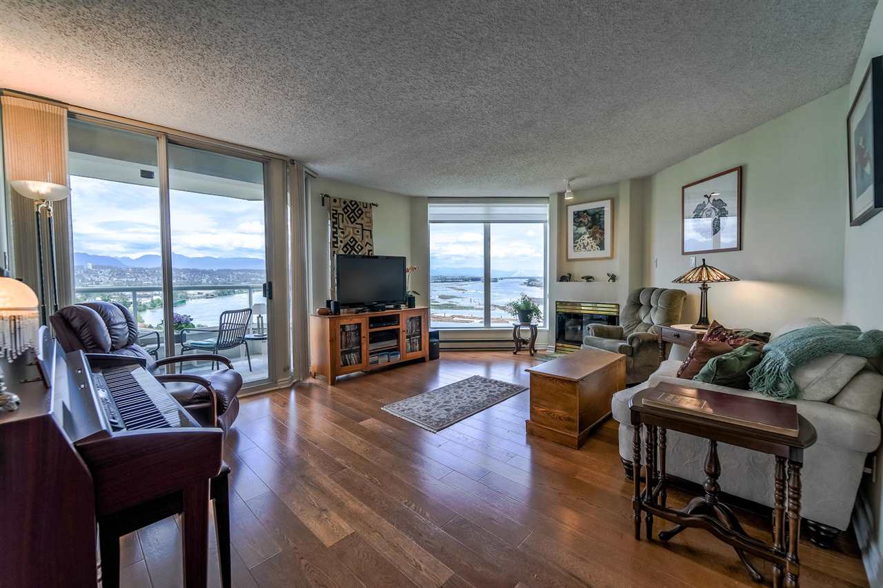 Welcome to the Palace Quay, a concrete building by Bosa & 1 of New West's best kept secret! Stunning view to the Fraser & mountains from 1 or 2 balconies or from the comfort of your living room w/floor to ceiling windows that brings in the natural light. This spacious end unit boasts over 1340 sq w/3 bedrooms, 2 updated baths w/granite counters + engineered HW thruout. Gas F/P incl in strata fees. The huge kitchen has access to balcony + insuite laundry. Convenient location - walk to the Royal Crown Castle Pub or short ride to Canada Games Ctr & Queen's Park. Excellent maintaining of this building that was re-piped in 2001, exterior painting in 2012 + newer roof. Fab amenities w/an I/D pool, gym, sauna, hot tub & bike room.