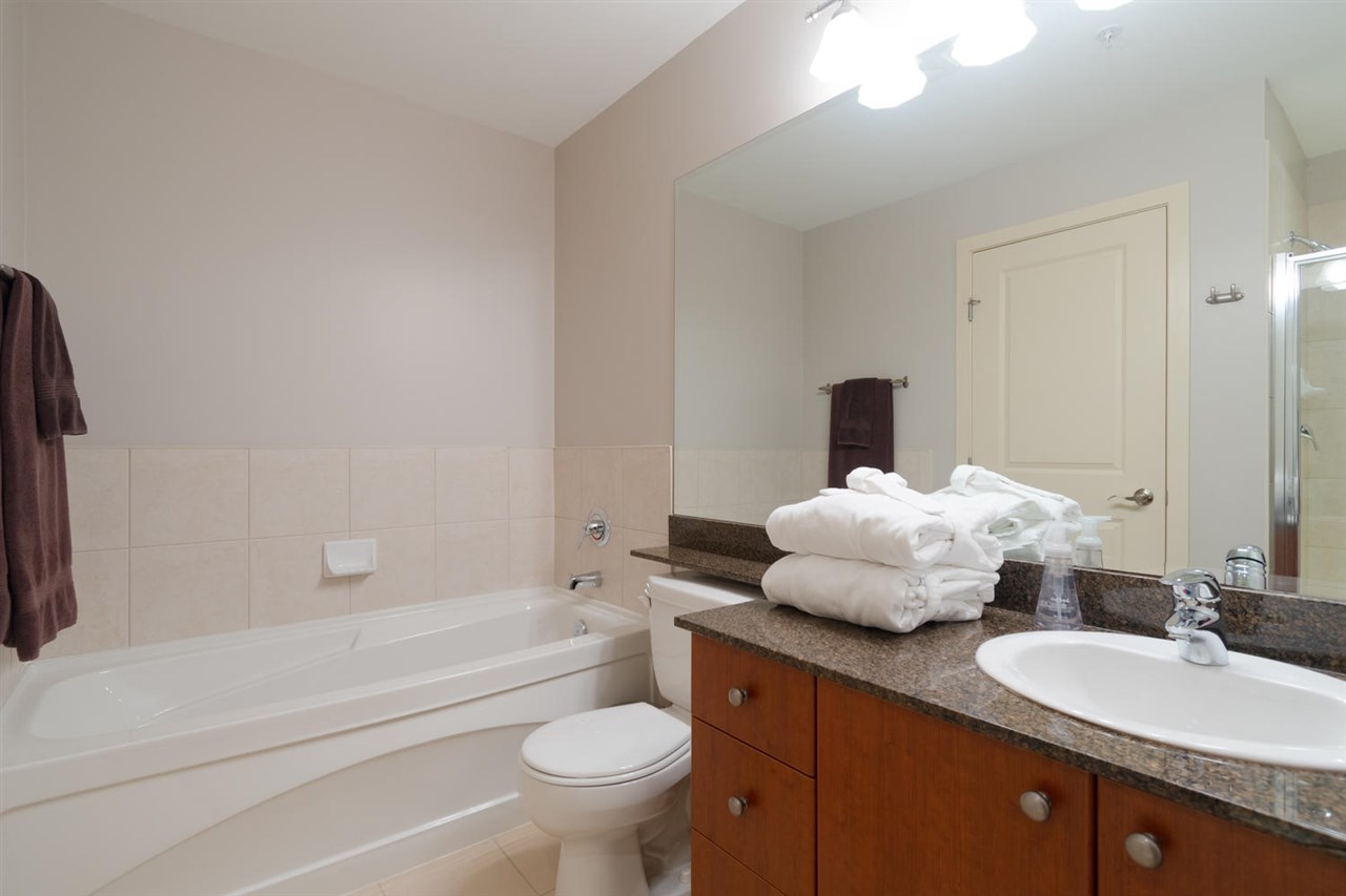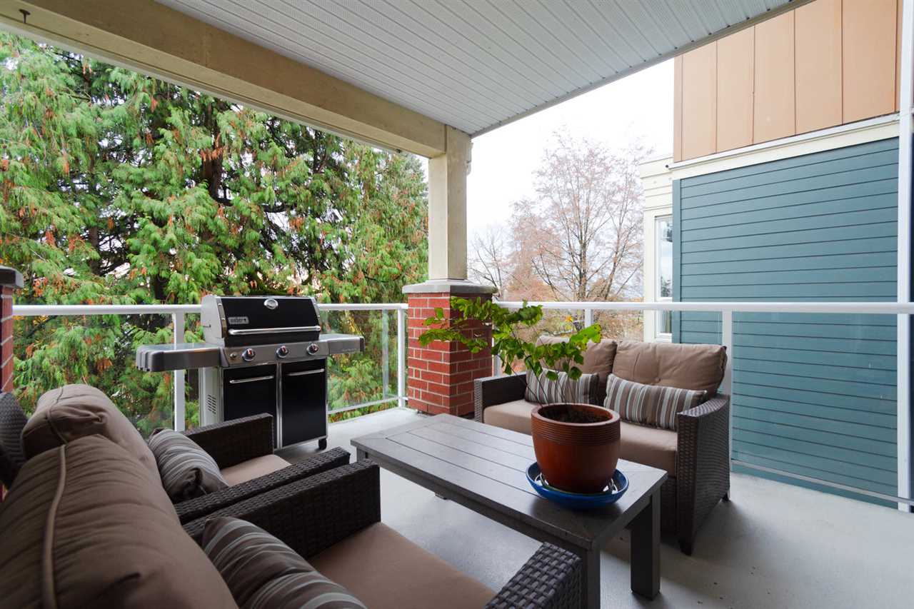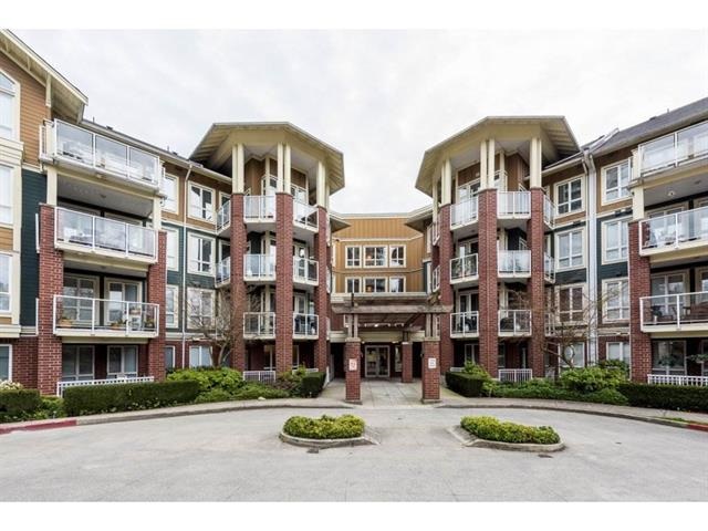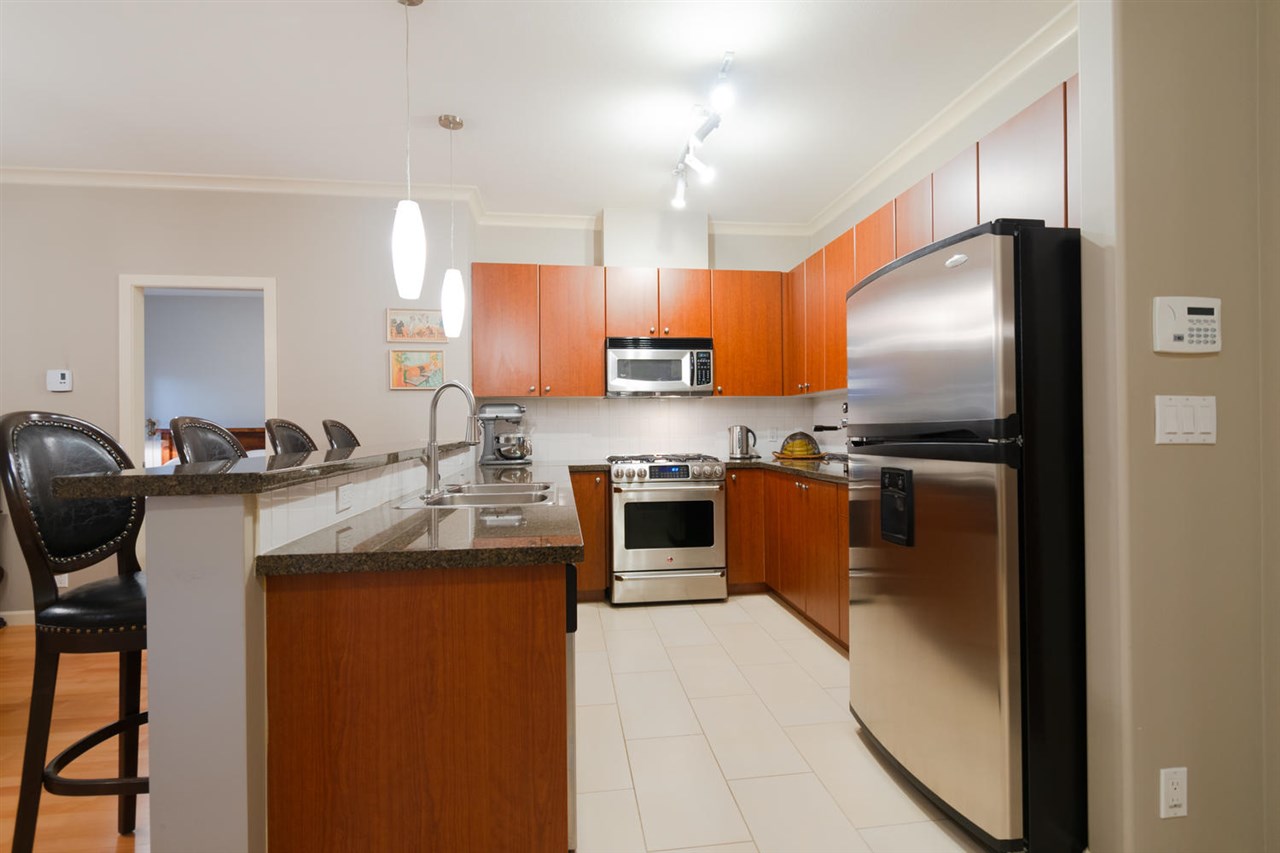 This immaculate 2 bedroom 2 full bathroom unit is sure to please even the fussiest buyer. The open kitchen with a large granite peninsula offers tons of cabinet/counter space - a chef's dream. The spacious living room extends to a very large (13'3 x 12'8) private deck with views of the Fraser. Master bedroom has access to the deck, a walk in closet and a 5 piece en-suite. The large second bedroom has his & her closets and a cheater en-suite. NEW hot water tank, washer/dryer and stove, TWO side by side parking stalls and storage locker. Great amenities in the building include a party room, fully equipped gym, guest suite and visitor parking. One dog or one cat permitted. This home shows remarkably well!