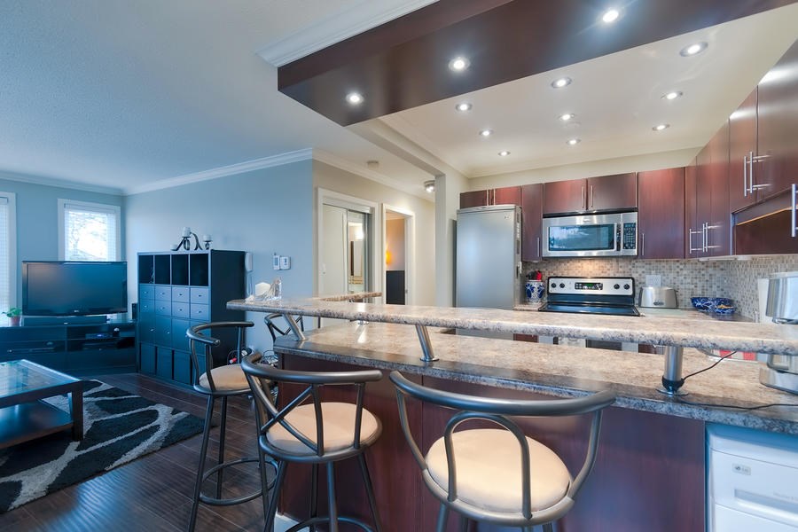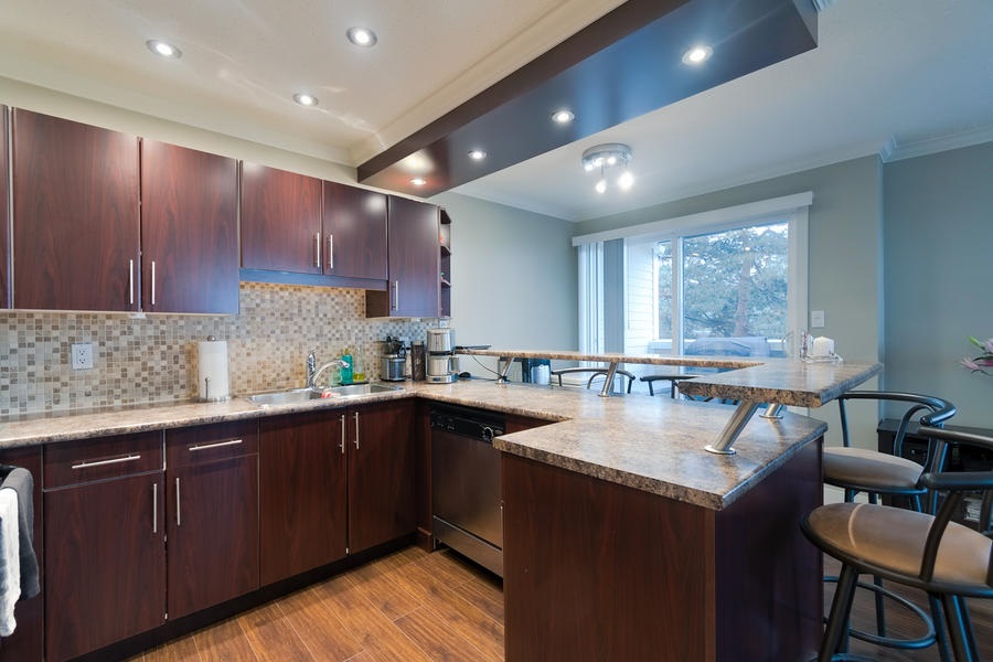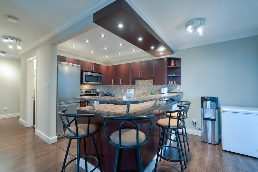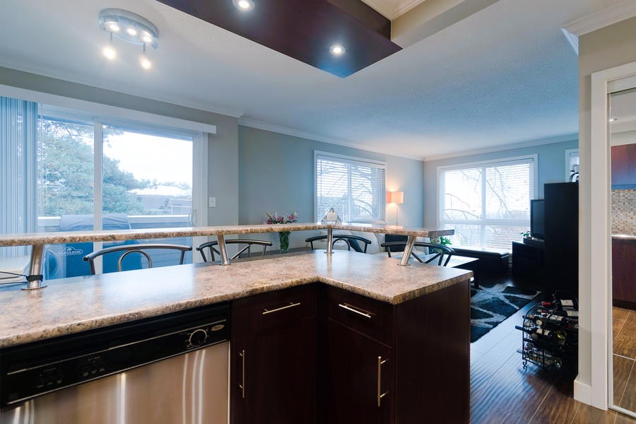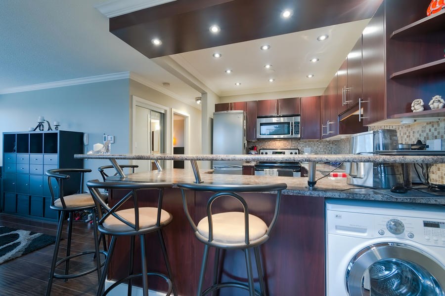 This remodelled 1 bedroom home built by Bosa has been fully rainscreened. Located just minutes away from Skytrain, transit, schools, parks & shopping. With a walk score of 82, you have all your amenities close at hand. Immaculate & ready to just move into, you will enjoy the spacious kitchen w/SS appliances, tile backsplash, updated lighting, granite counters including sit up breakfast bar. Lots of windows let in the natural light. Bonus European style insuite washer/dryer. A modern, open plan concept with 2 private balconies that access from the Master Bedroom & dining room. Well maintained building with newer roof, upgrades & pipes. 2 cats permitted but no dogs. Rentals allowed with some restriction.