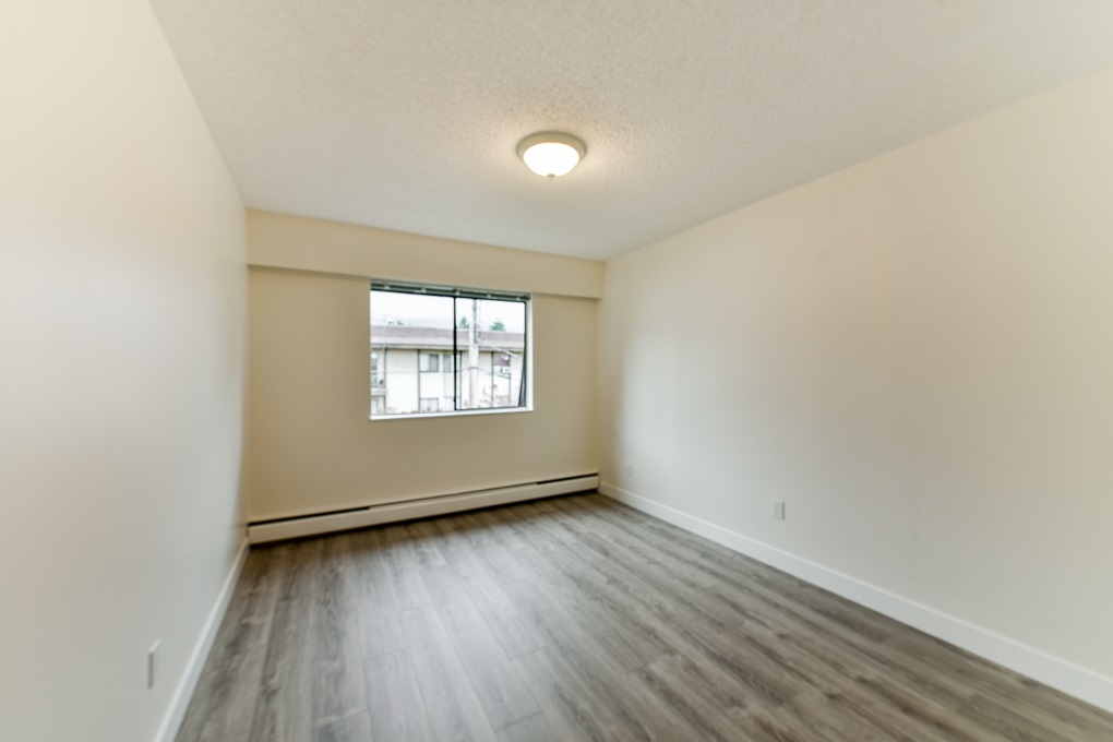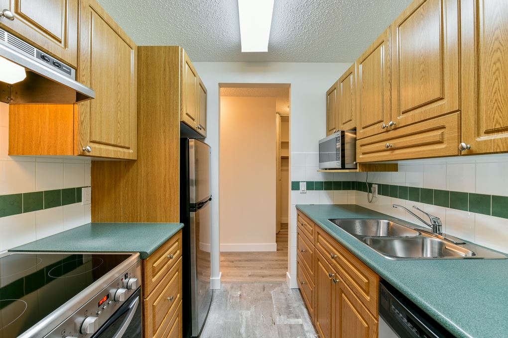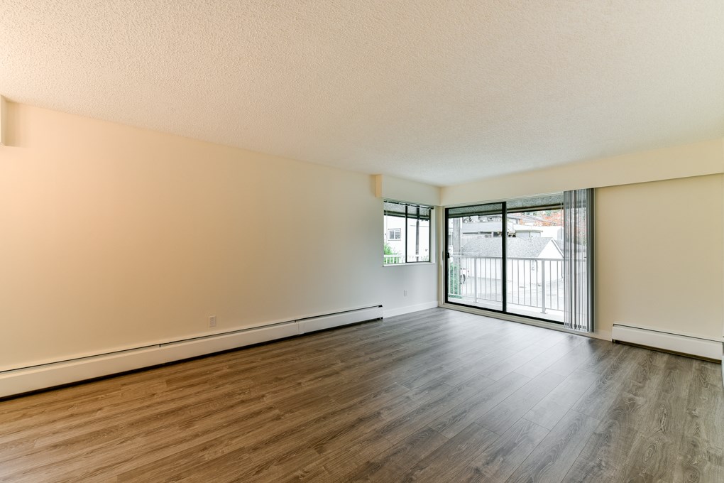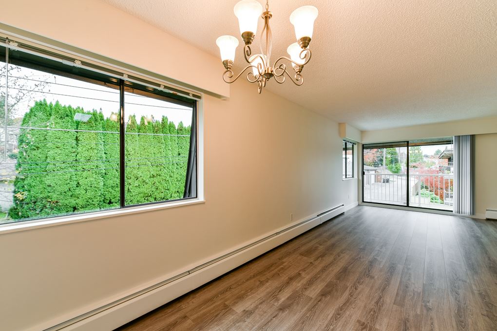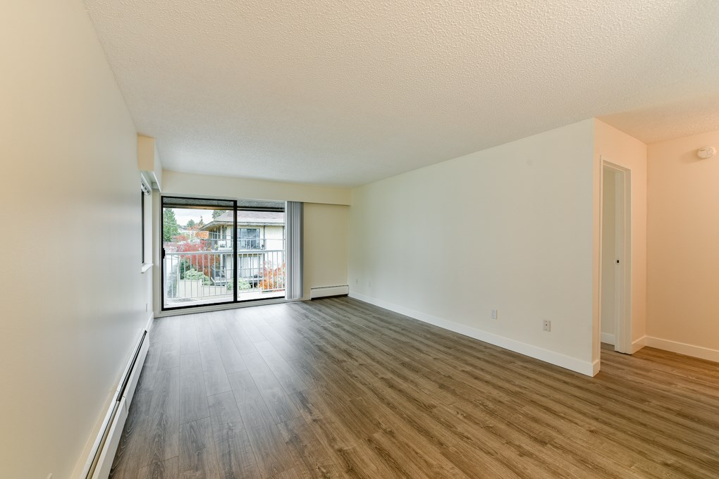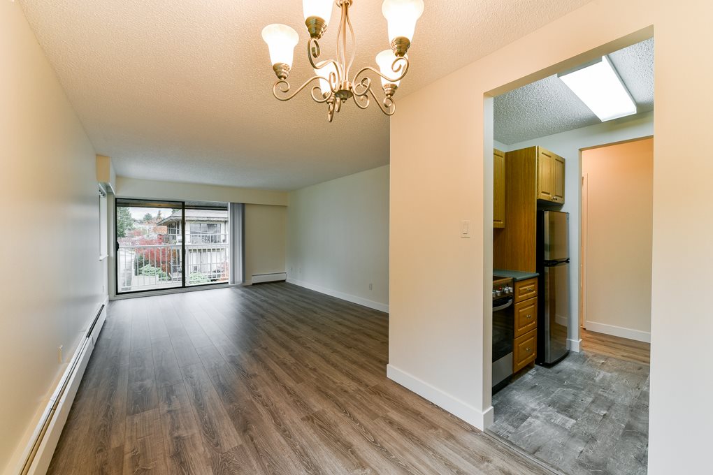 Beautifully renovated top floor corner, 656 sq ft (Measured by Onikon/Strata Plan shows 650 sq ft) 1 bdrm suite in Westmount Arms in the heart of Sapperton. Located near Skytrain, shopping, parks & amenities. This bright immaculate suite has new laminate flooring, paint, SS applcs, light fixtures & baseboards and features a wrap around balcony with mountain views, newer cabinets in kitchen & baths & much more. Maintenance fee includes heat, hot water & shared laundry. 1 pet OK.