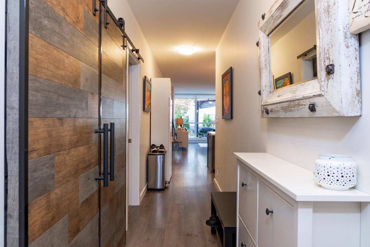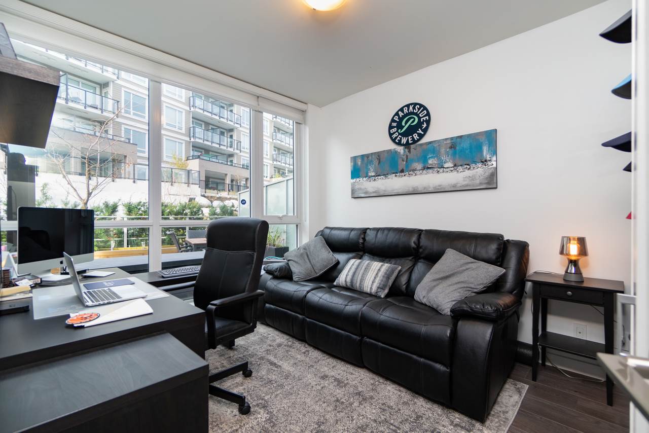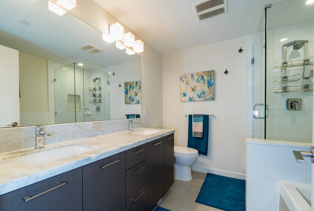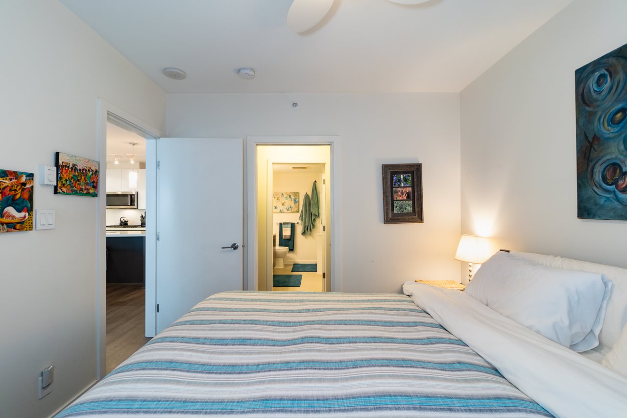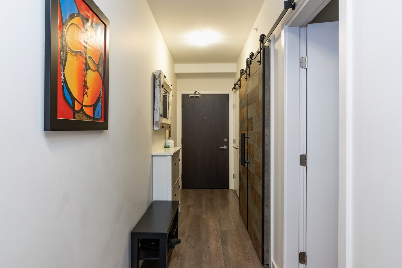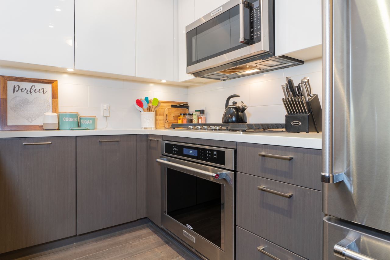 Gorgeous 2 years old 2 bedroom, 2 baths, suite with HUGE private patio and your own fireplace. kitchen with quartz counters, stainless steel appliances, gas cook top; 2 side by side parking stalls, high-end tile and laminate floors, spa-like bathrooms & Mstr bdrm with heated floors. Building well maintained & managed with excellent gym, outdoor pool & swirl pool, theater and social room & lots of visitor's parking. Pets and rental OK. Walking distance to bus station, queen's park, shopping center.