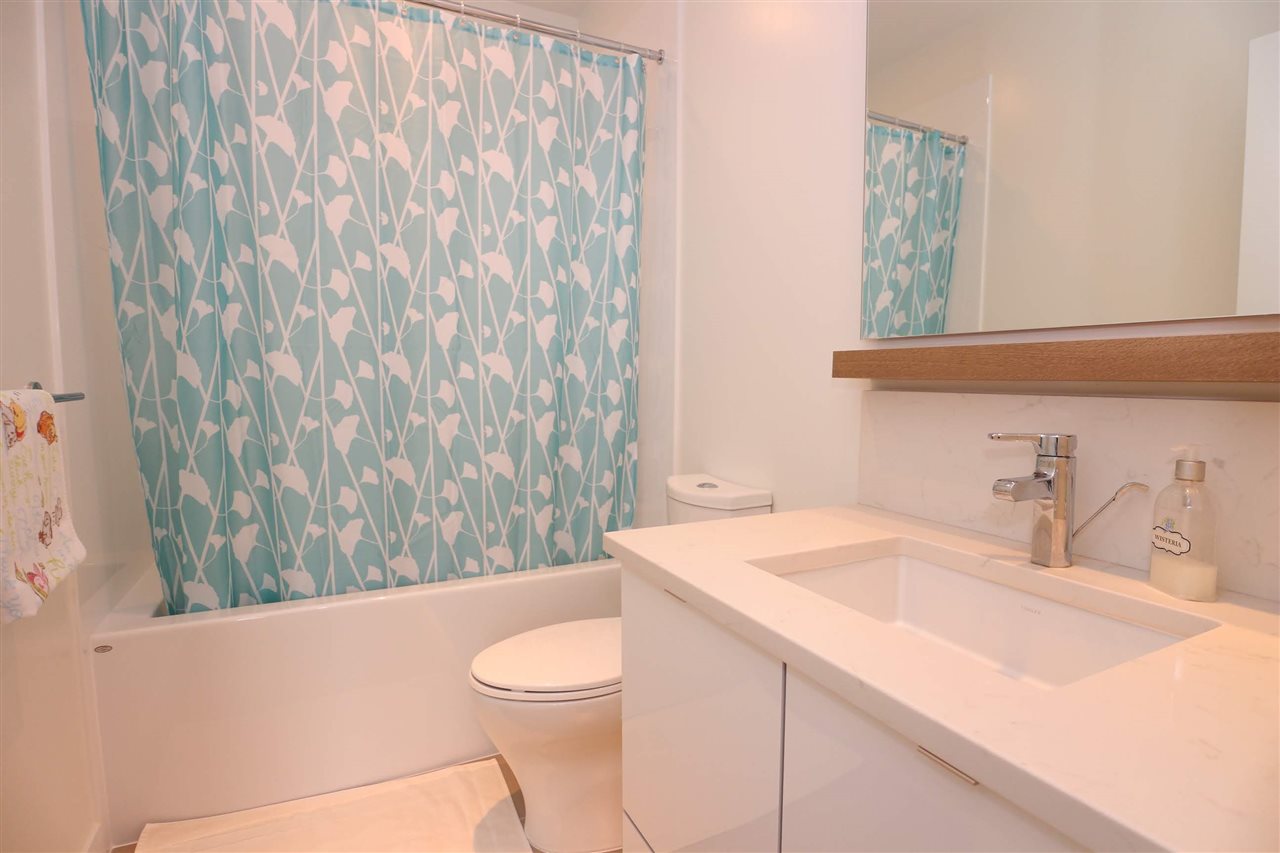 SAPPERTON-The heat pump equipped(A/C), three storey townhome located in the Brewery District; steps away from skytrain, shops and restaurants. Open concept kitchen with Kitchen Aid S/S appliances, gas stove, and quartz countertop. Large floor to ceiling windows throughout the home invites all the natural light in. One bedroom on main and two bedrooms with ensuite above. Spacious Master bedroom featuring 14' vaulted ceiling with large south facing windows to enjoy the beautiful waterfront view. Personal rooftop deck with dedicated gas line for BBQ fun! Included with 2 parkings and an over size storage. The amazing 10,000+ sq.ft amenity centre is fully equipped with gym, squash court, yoga studio, sauna/steam room, rooftop deck with BBQ and fireplace...etc! Come and see!