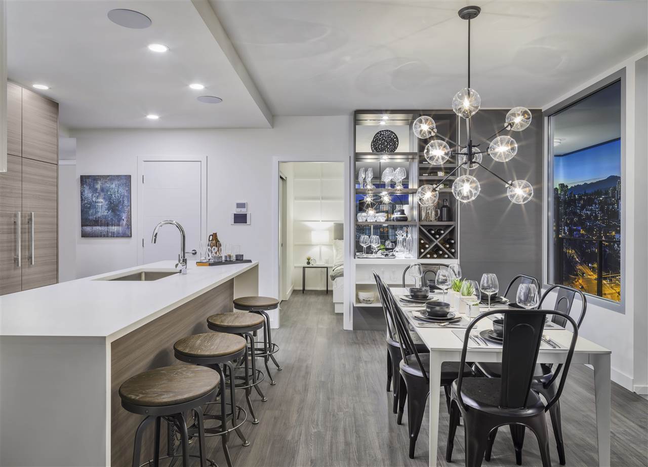 Ovation offers a diverse selection of 204 modern homes within a 32-storey architectural landmark in Downtown New Westminster. Ovation is located across the street from the New Westminster Skytrain station, transit hub and the Shops at New West Station. This northwest exposure one bedroom floor plan offers wide-plank laminate flooring throughout, 24-inch European appliances package, and a spacious waterfall kitchen island for dining and entertaining. Please visit the Ovation Presentation Centre at 1001 Columbia St. New Westminster or phone the Sales Team for more information. We are open everyday except Friday's from 12-5PM.