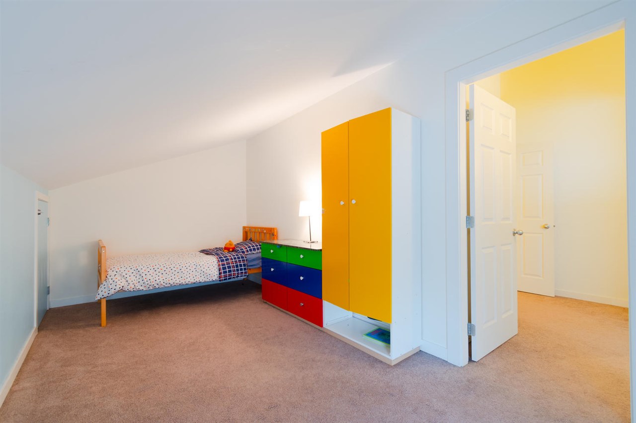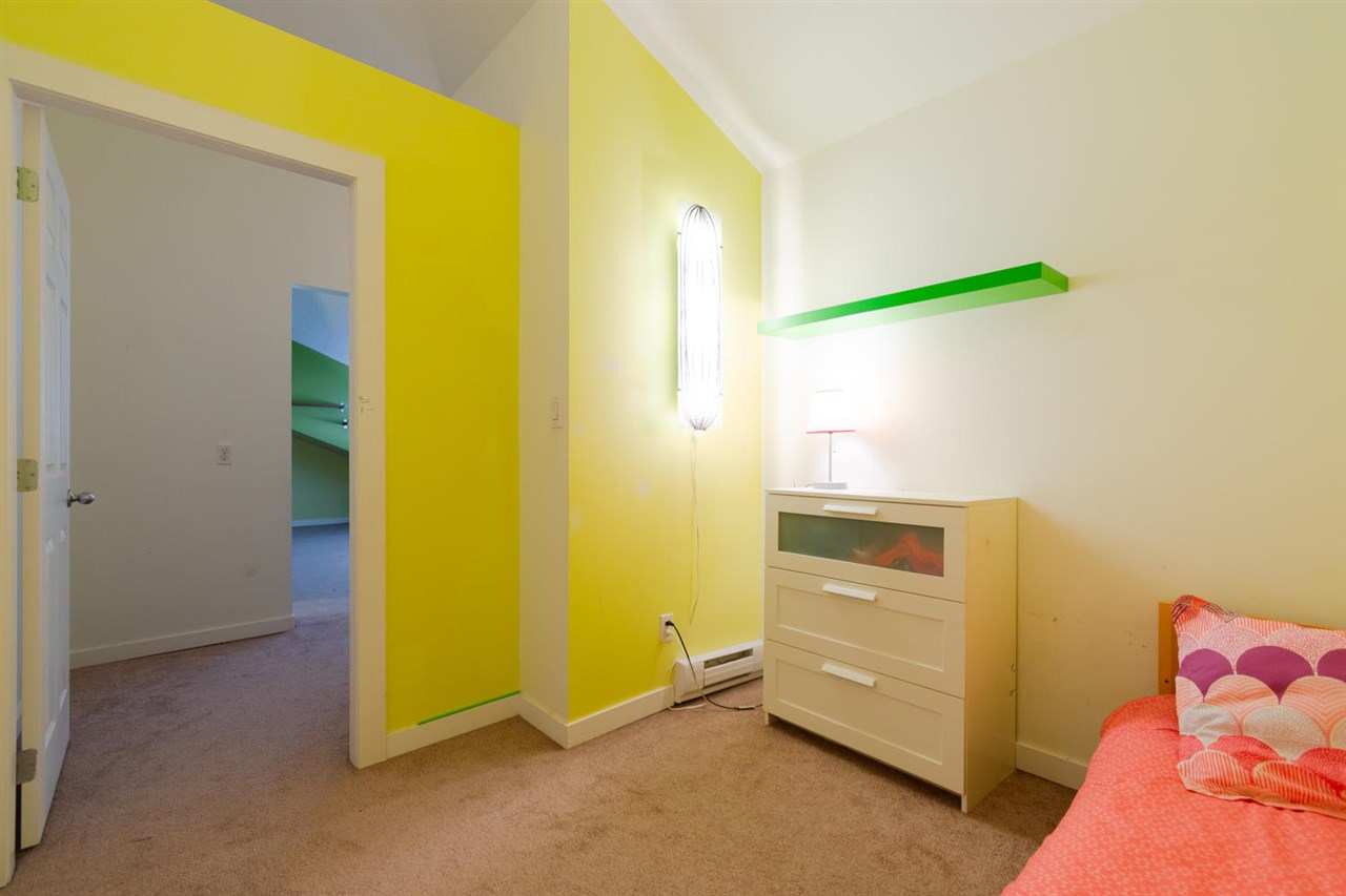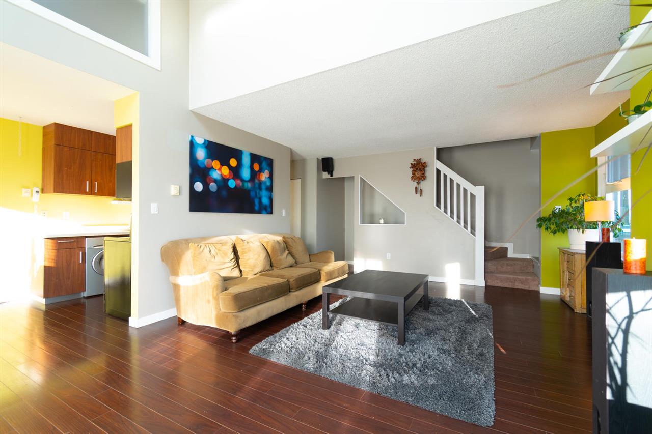 Visit this townhouse style well kept 2 level loft home. Laminate wood floors greet you at the entry & flow throughout the main floor. Passing the galley kitchen w/ s/s appliances including a clothes washing machine, the dining room opens up to reveal a large living room w/ vaulted ceilings to the loft space above & skylights that pour light in to compliment the bay window & double sliding glass doors to the sundeck w/ views towards the Fraser River. The master bdrm that shares the same sunny exposure sits away from the living room & next to the updated 4 piece bathroom. An area under the stairs to the loft has been used for a computer desk in the past. Upstairs a bright loft / family room takes advantage of the natural light and gives way to the 2 upstairs bdrms w/ peaked ceiling lines.