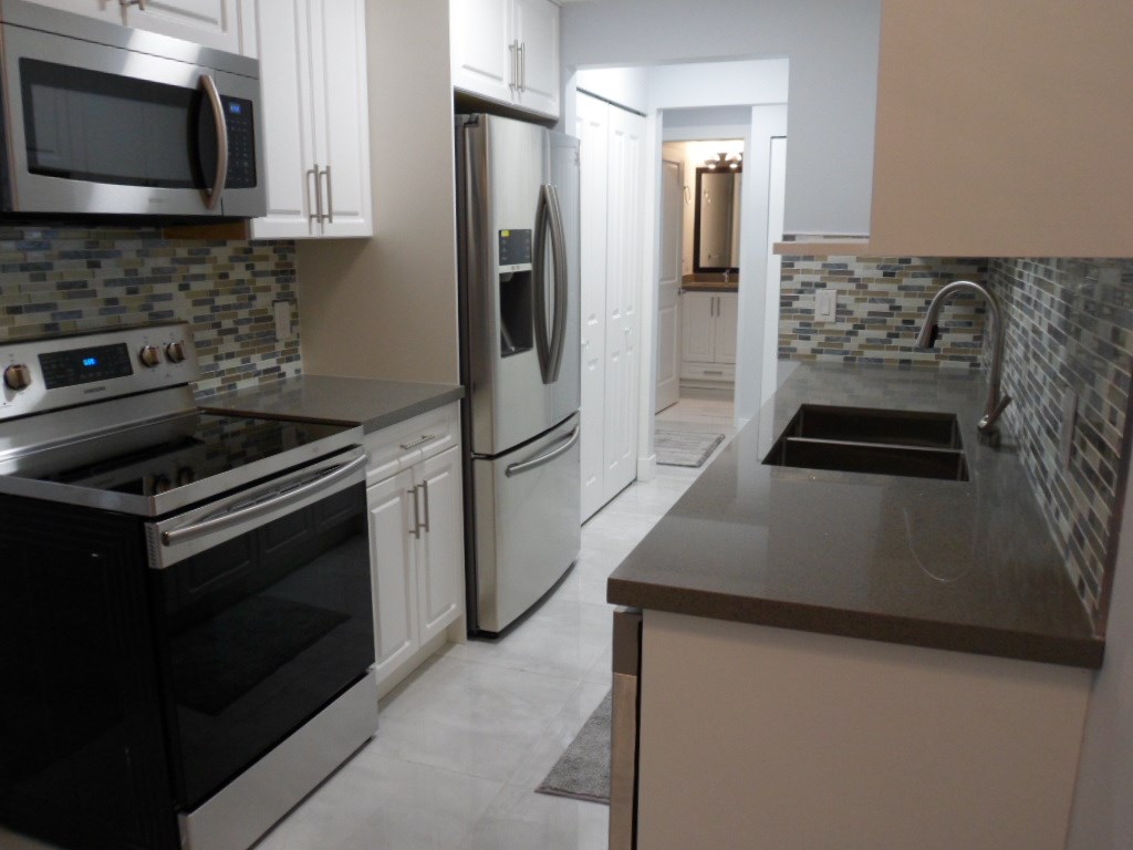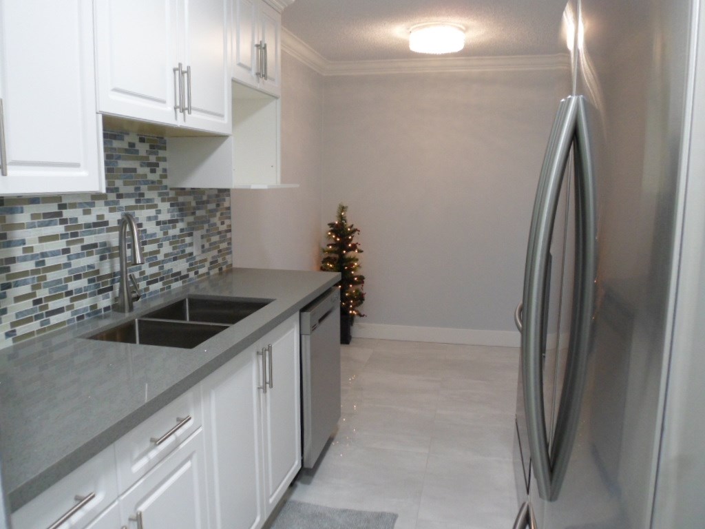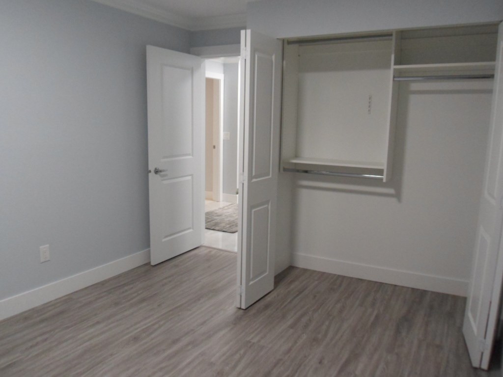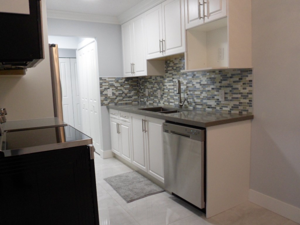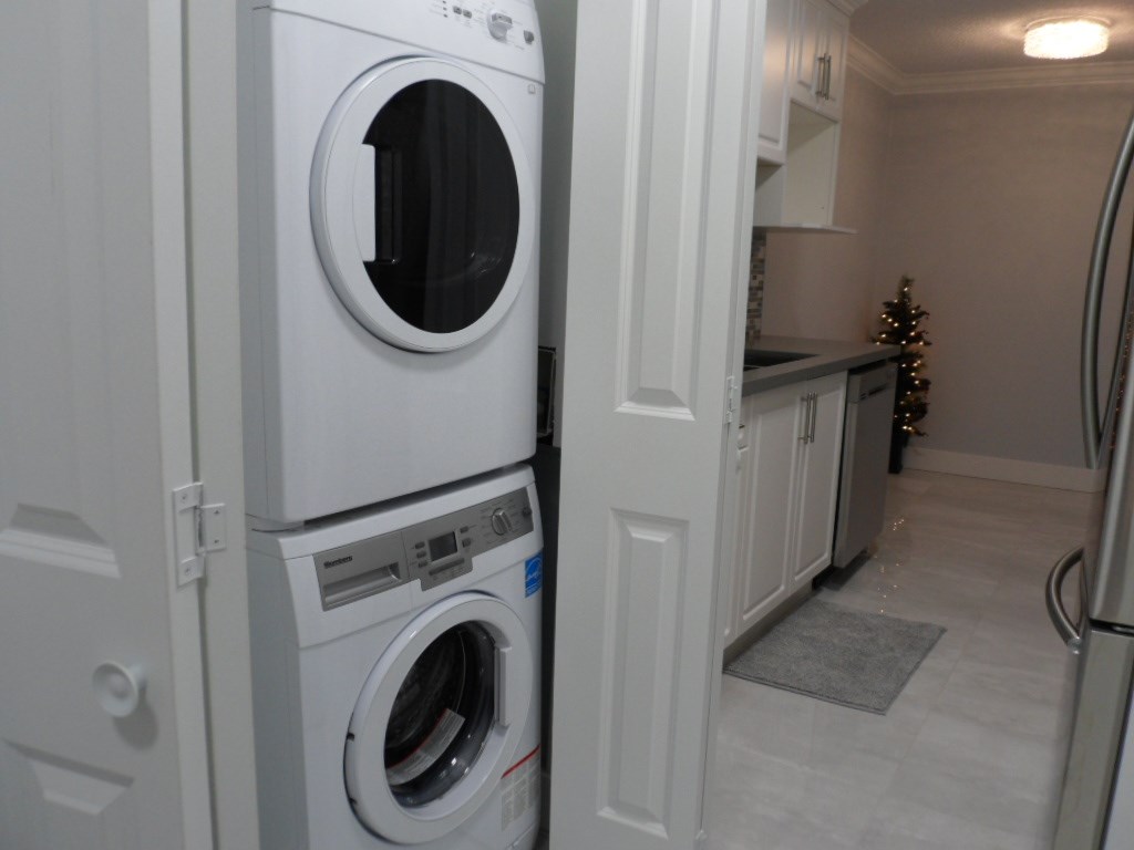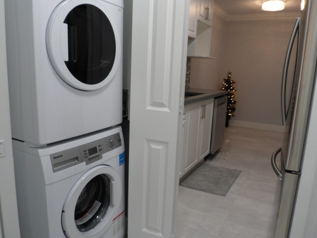Extensive Renovations! Immaculately done-up, like brand new inside! New flooring, new paint, new bathroom, new kitchen, new plumbing and electrical fixtures & Brand New Stainless Steel Appliances!! 2 bedrooms, 1 bath. In-suite Laundry - brand new as well! Well maintained complex. Facing the quiet side of the building with Balcony. Partial view. Great location - close to shopping, transit, schools, entertainment and restaurants. Rentals are allowed. Will not last, call today for your private viewing.