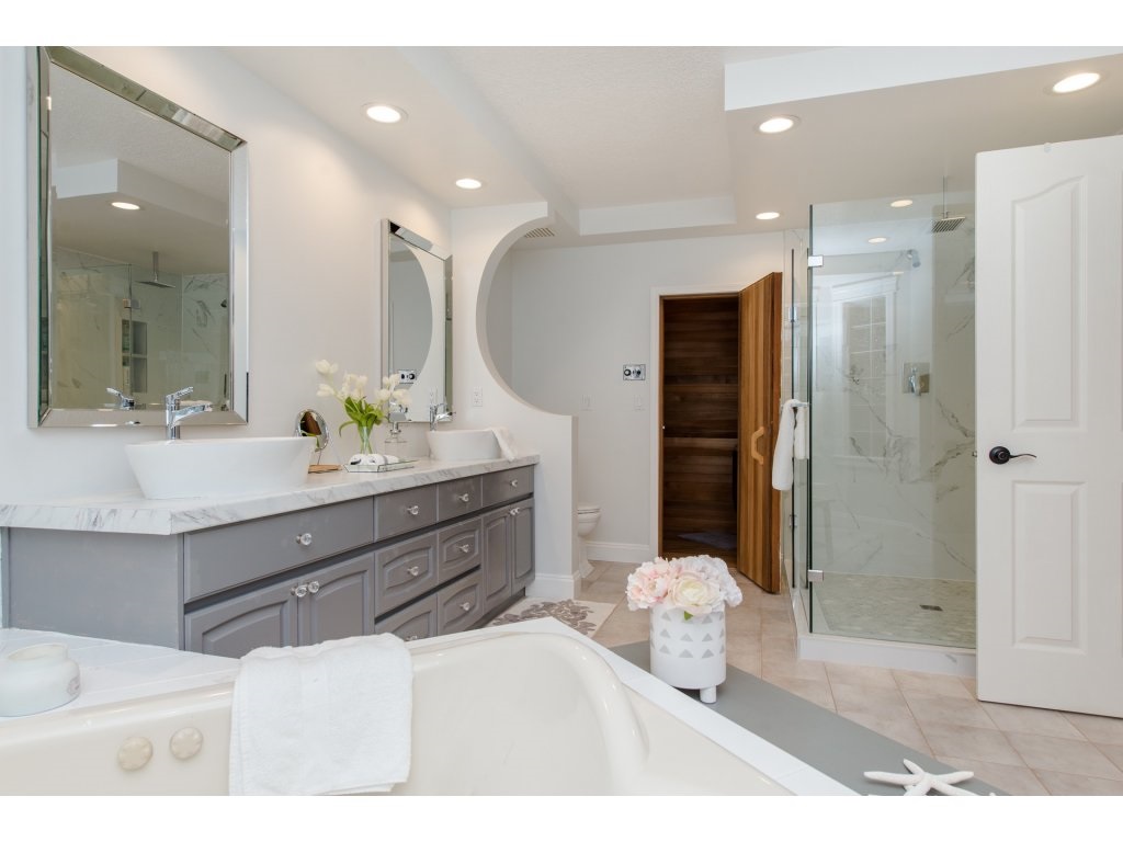 Great cul-de-sac location, soaring ceilings and vaults define this incredible 2 storey with basement home. Amazing updates, expansive entry, masterful use of crowns and mill-work throughout, gourmet kitchen with quarts top counters, island and modern drop hood fan over stove. Huge master bedroom on the main with separate 4 piece double Jacuzzi en-suite, two way fireplace & sauna. Out of the 3 fireplaces in home two of them are two way, Two large bedrooms up and den or fourth bedroom in the basement, easily suitable basement with a wet bar in place. Family room walks out to an entertainers back yard with two huge patio's and heart shape hot tub in solarium. Wow!! Wow!! Wow!!