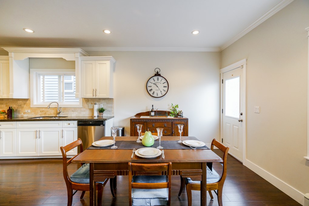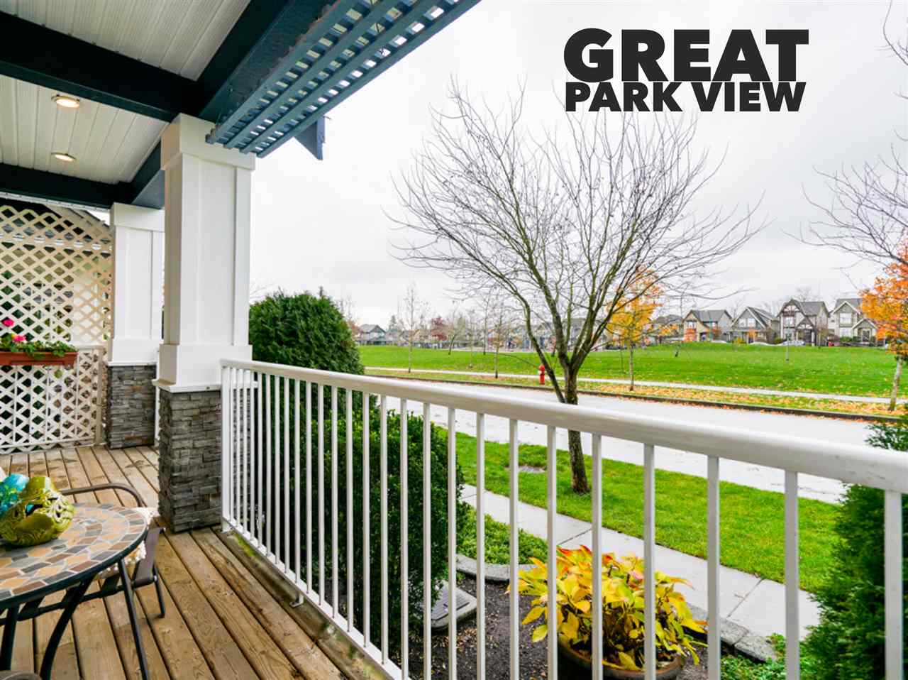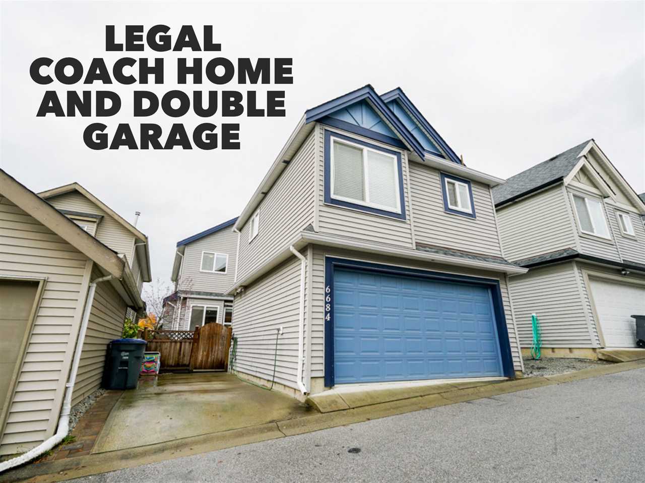 DESIGNER COACH HOME overlooking the PARK! Just walk across the street for a great play area for kids & pets. Peaceful setting within walking distance to the proposed SKYTRAIN. A GREAT ROOM plan with rich white cabinetry, granite counters, high ceilings, picturesque windows, new carpets, fresh paint & upgraded SS appliances. East Exposed fully fenced backyard offers a large deck & covered area. LEGAL COACH HOME + a 1 or 2 bdroom unauthorized suite down.