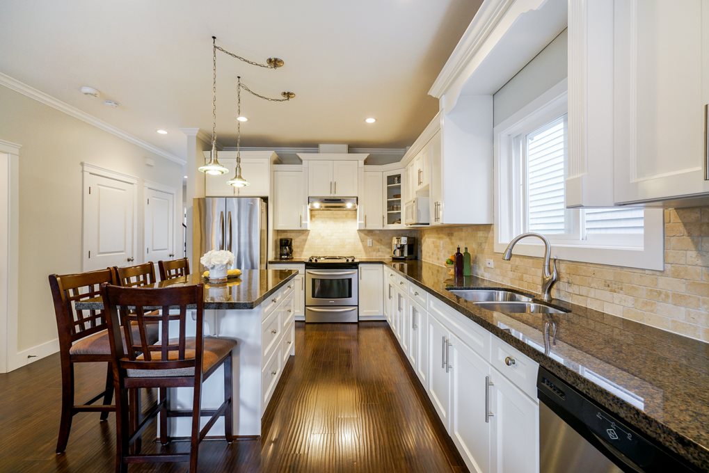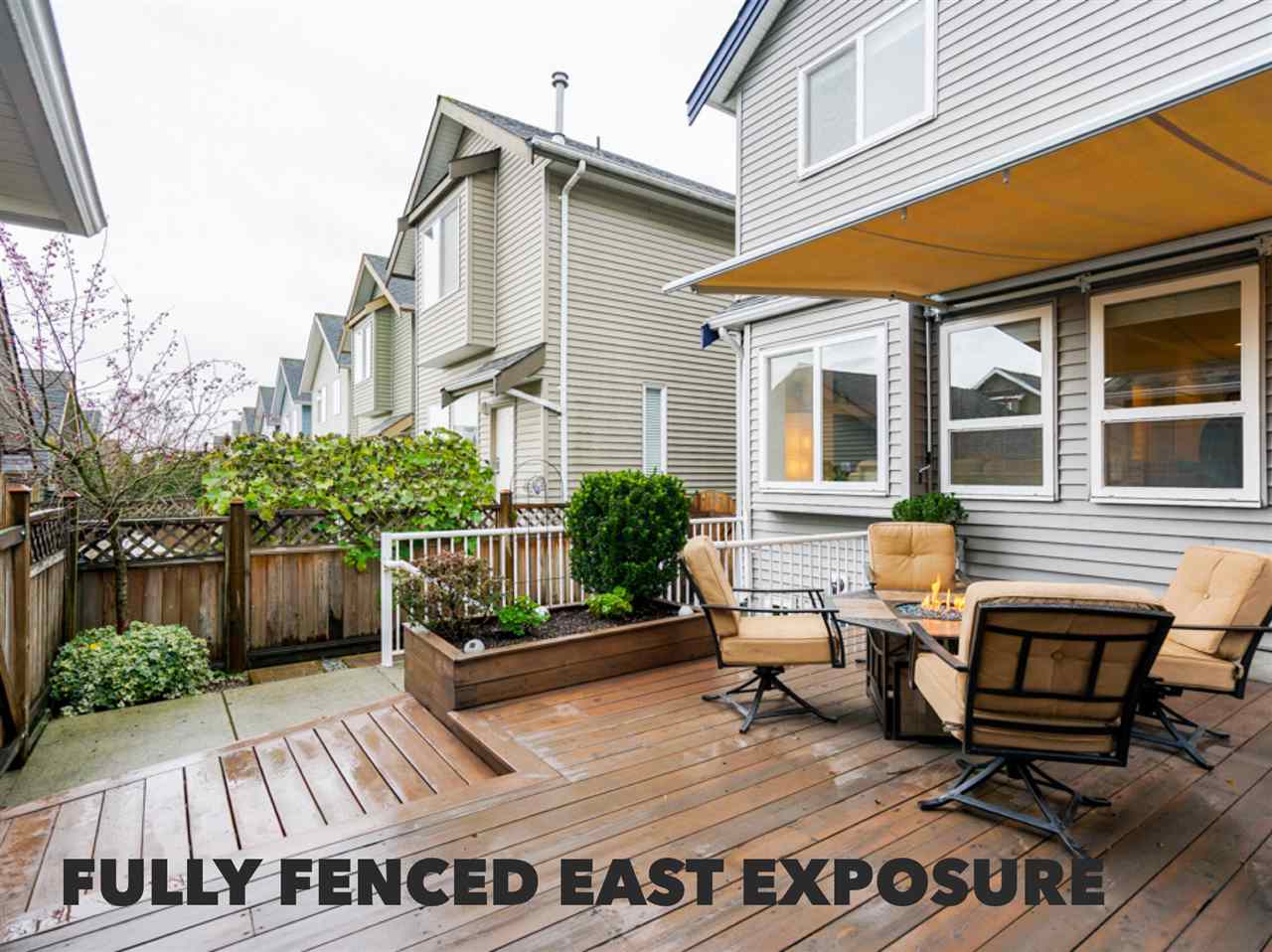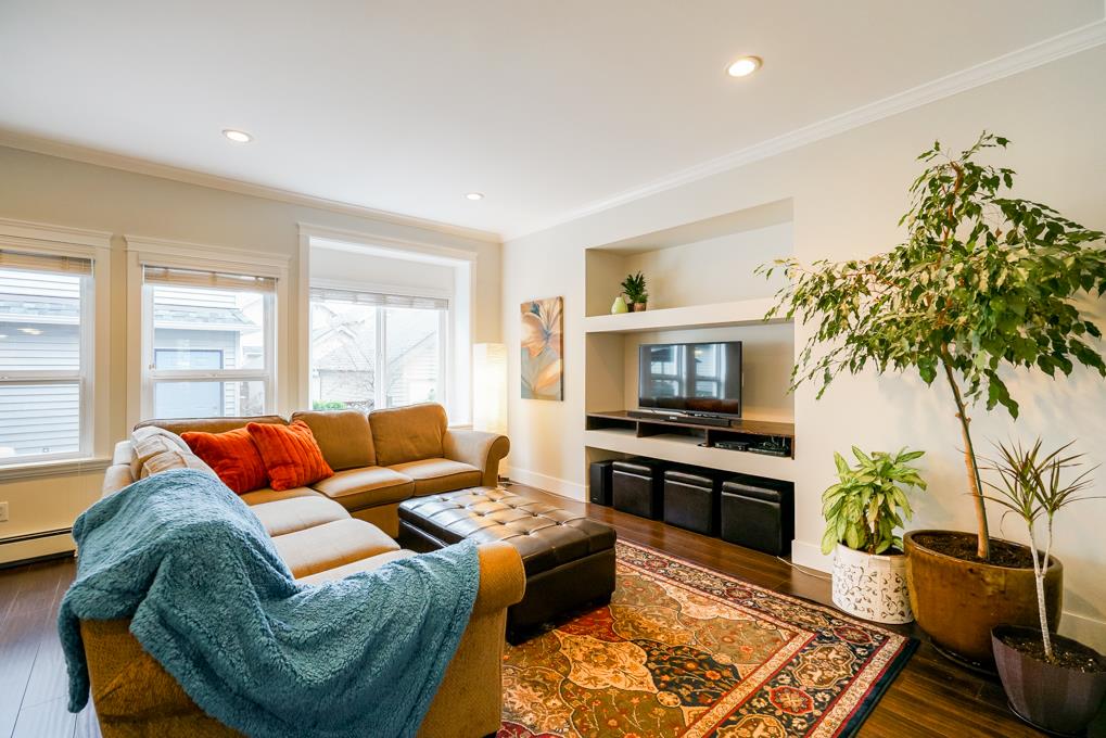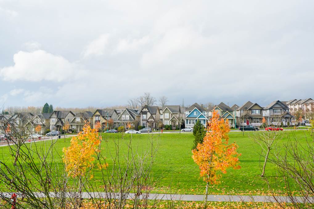 DESIGNER COACH HOME overlooking the PARK! Just walk across the street for a great play area for kids & pets. Peaceful setting within walking distance to the proposed SKYTRAIN. A GREAT ROOM plan with rich white cabinetry, granite counters, high ceilings, picturesque windows, new carpets, fresh paint & upgraded SS appliances. East Exposed fully fenced backyard offers a large deck & covered area. LEGAL COACH HOME + a 1 or 2 bdroom unauthorized suite down.