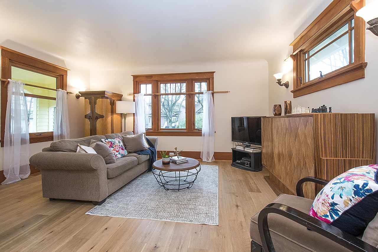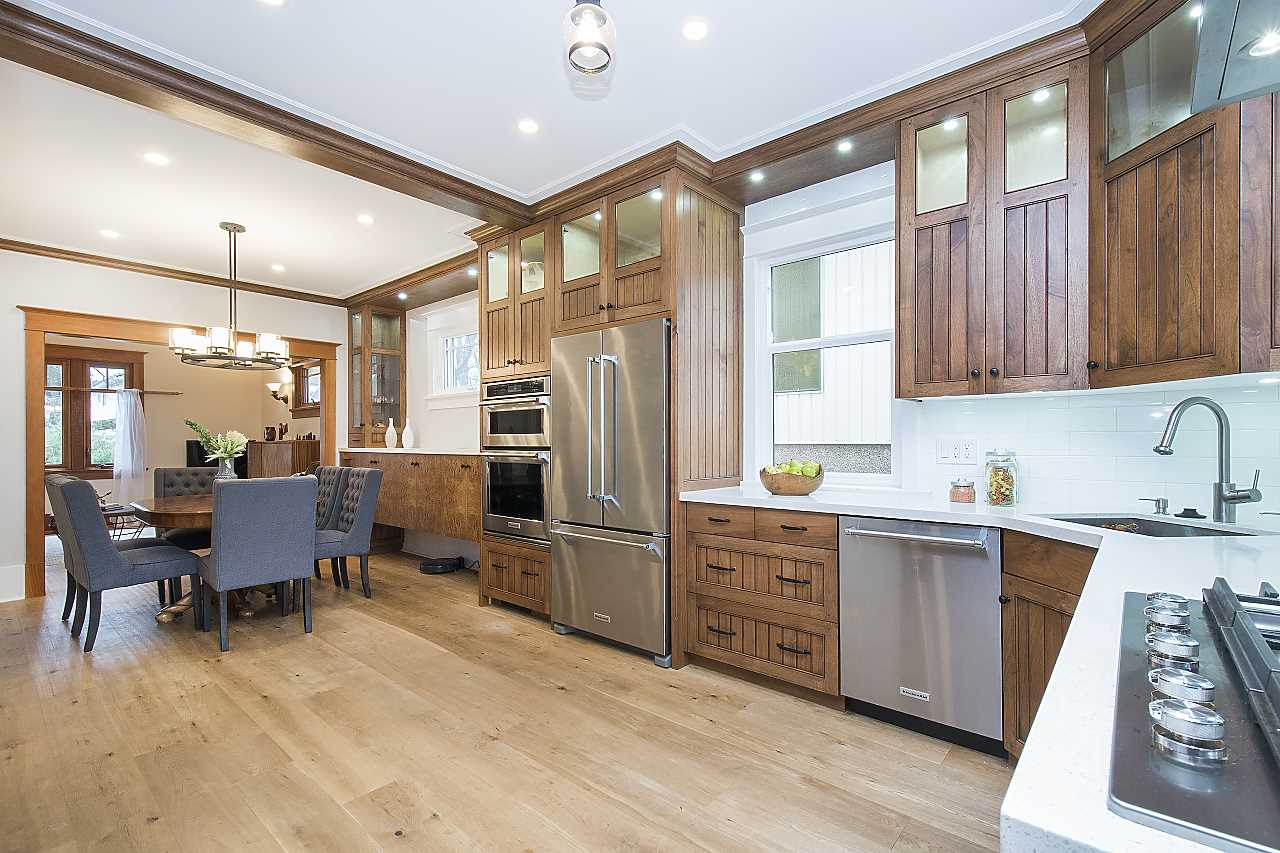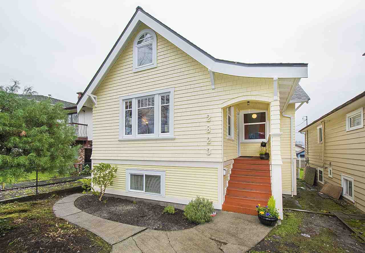 This beautiful family home in on a tree lined street in Hastings Sunrise has both character and style. Features include an amazing custom kitchen with blond walnut cabinets, quartz counter tops, and SS appliances, custom millwork, hardwood floors, skylights, updated bathroom on the main, hot water on demand, new back deck, 1 bedroom legal suite, fenced yard, and garage with workshop/studio space. Located in a mature, quiet neighborhood close to all levels of schools with easy access to downtown, North Shore and Burnaby. Don't miss this one of a kind beauty!
