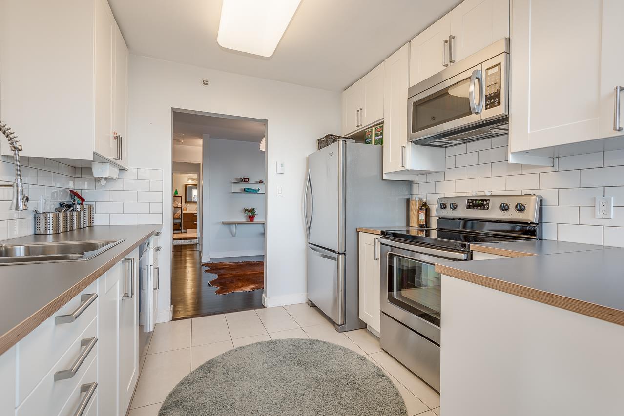 Downtown with a view! 3 bedroom, 2 bath with in-suite laundry and fully renovated in 2015. All stainless steel appliances, bamboo accented countertops and subway backsplash. Engineered black bamboo flooring throughout except tile in foyer, bathrooms and kitchen. Exercise room, Jacuzzi, Sauna, nice common outdoor areas. One parking stall and one locker. Pets and rentals allowed with restrictions. Skytrain at your door. Located near everything you could need with beautiful river view. Buyer to verify all measurements. Open House Saturday , Sunday 2-4pm